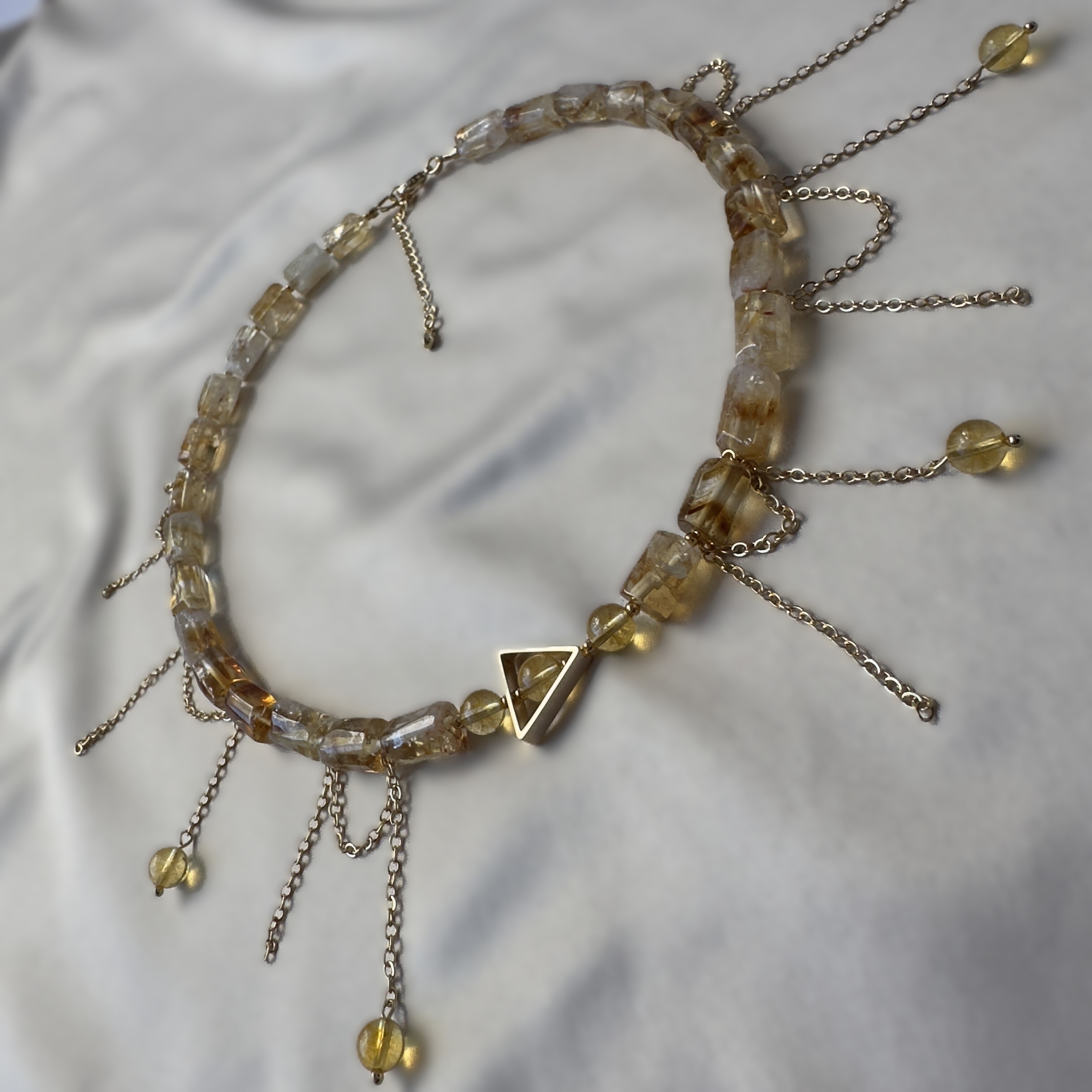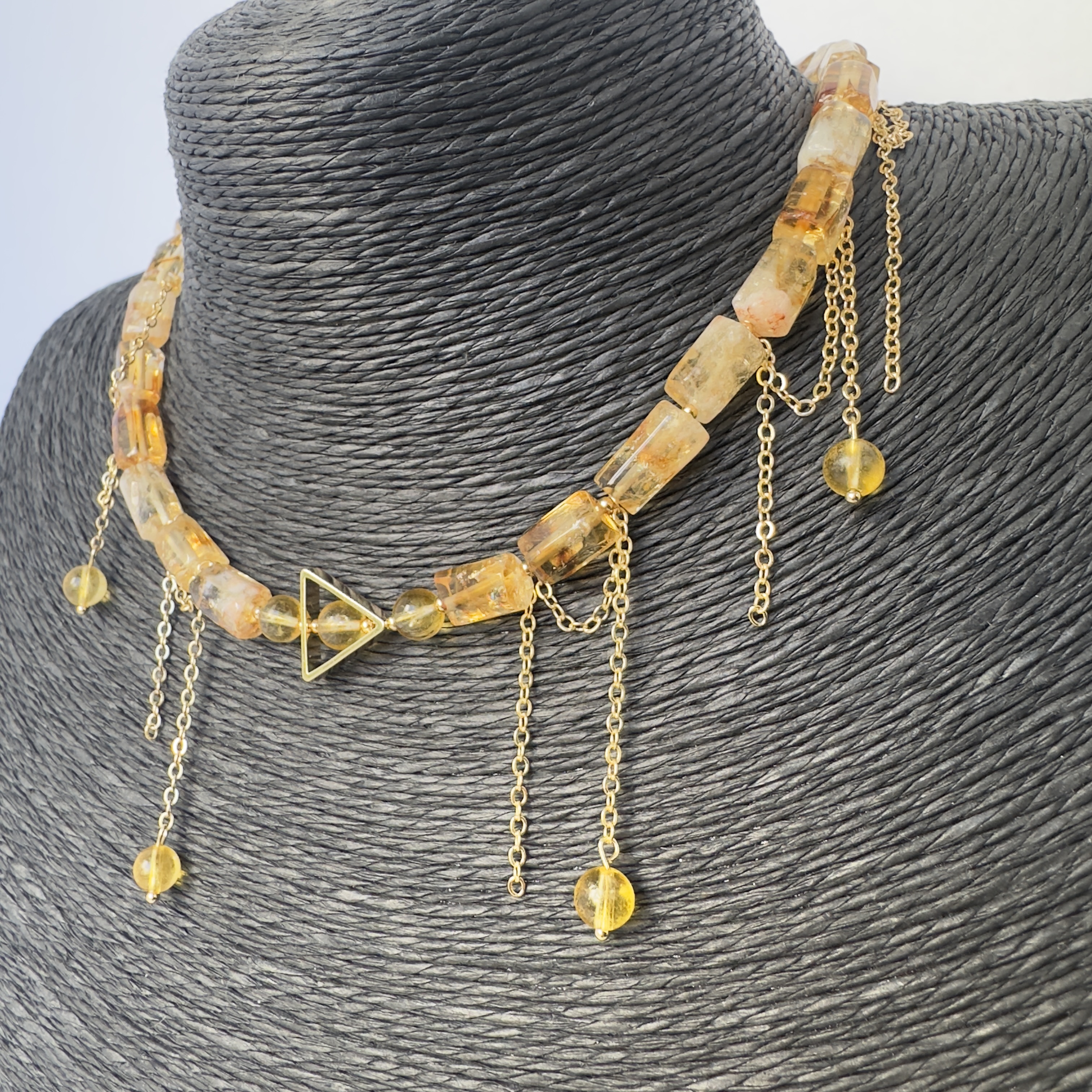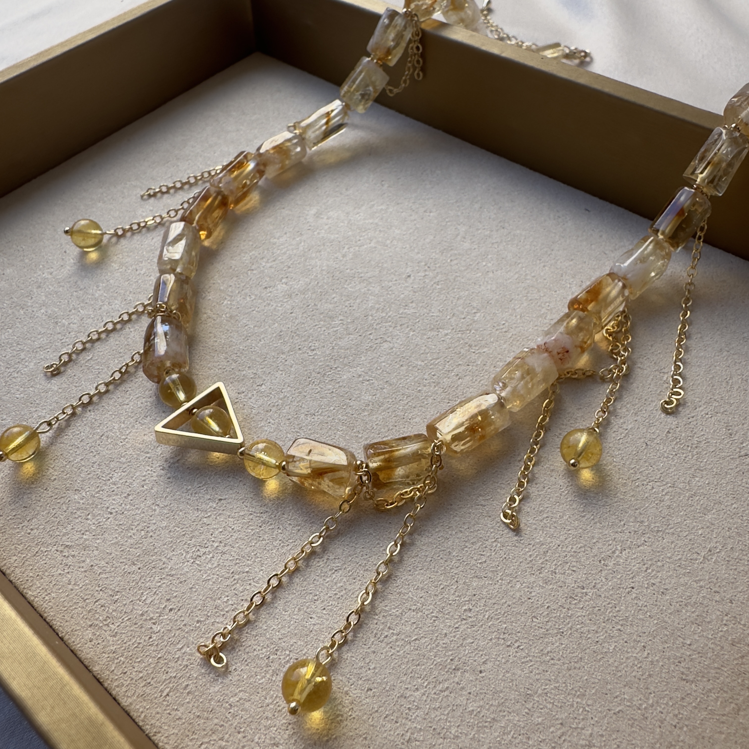 Состав и размеры: натуральный цитрин (кварц) — огранённые кубики/призмочки ≈6–9 мм; гладкие шарики-подвесы ≈6–8 мм; центральный геометрический элемент-треугольник (цвет золота); подвески-цепочки; фурнитура премиум (Корея). Длина по шее 40–45 см (удлинитель 5 см), замок-карабин.