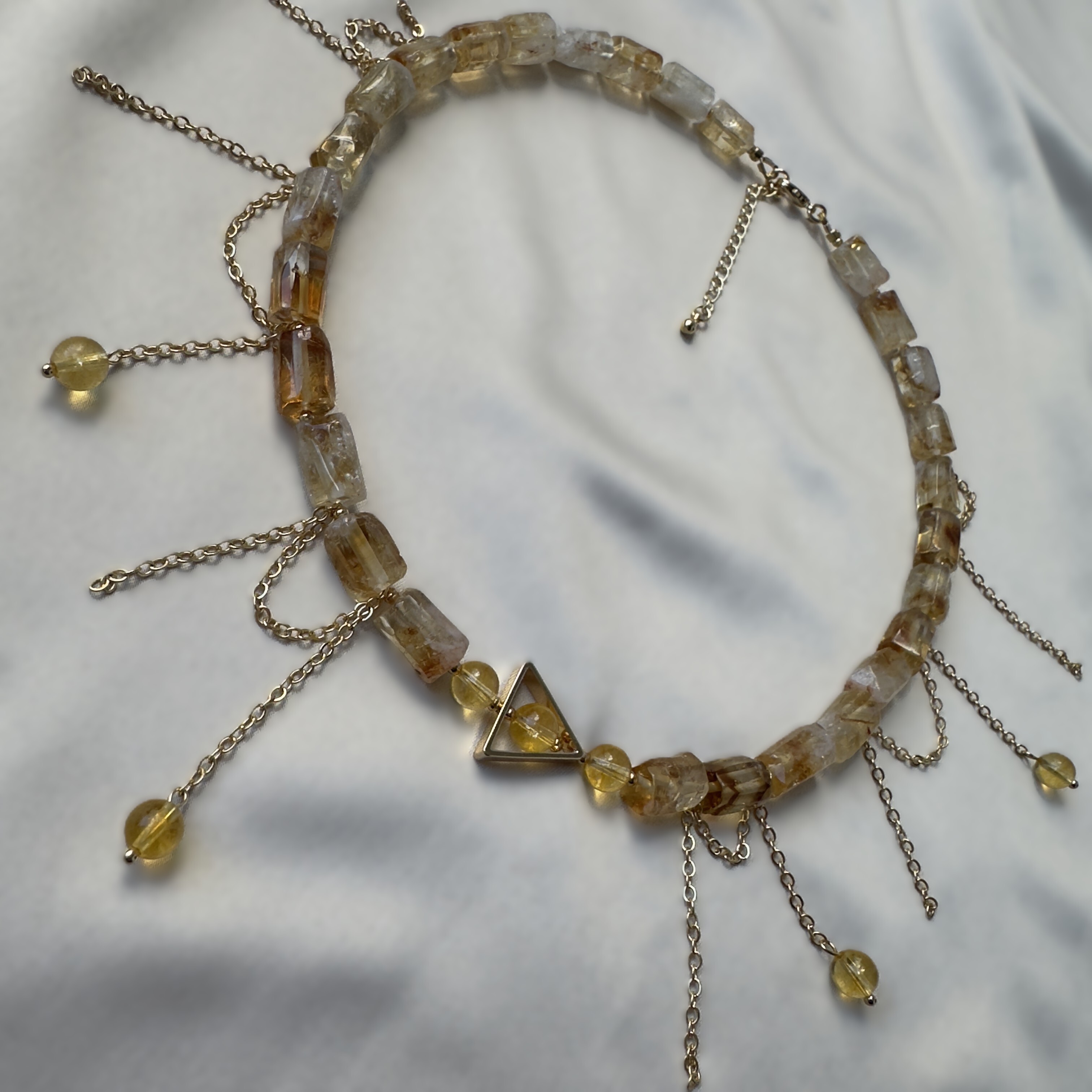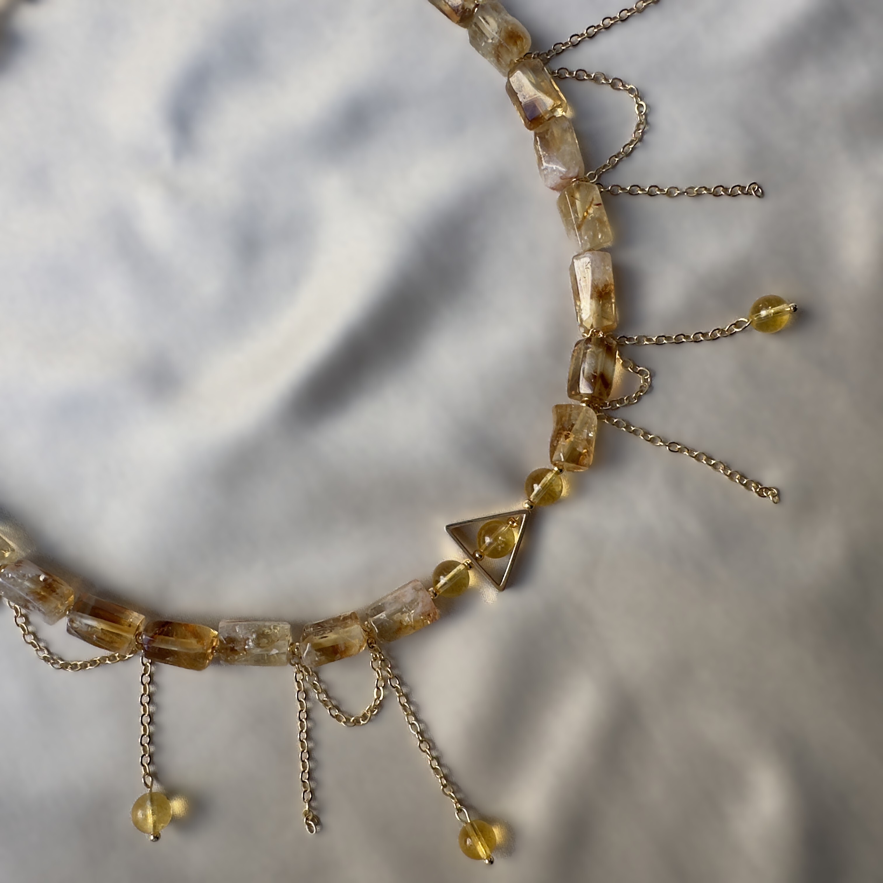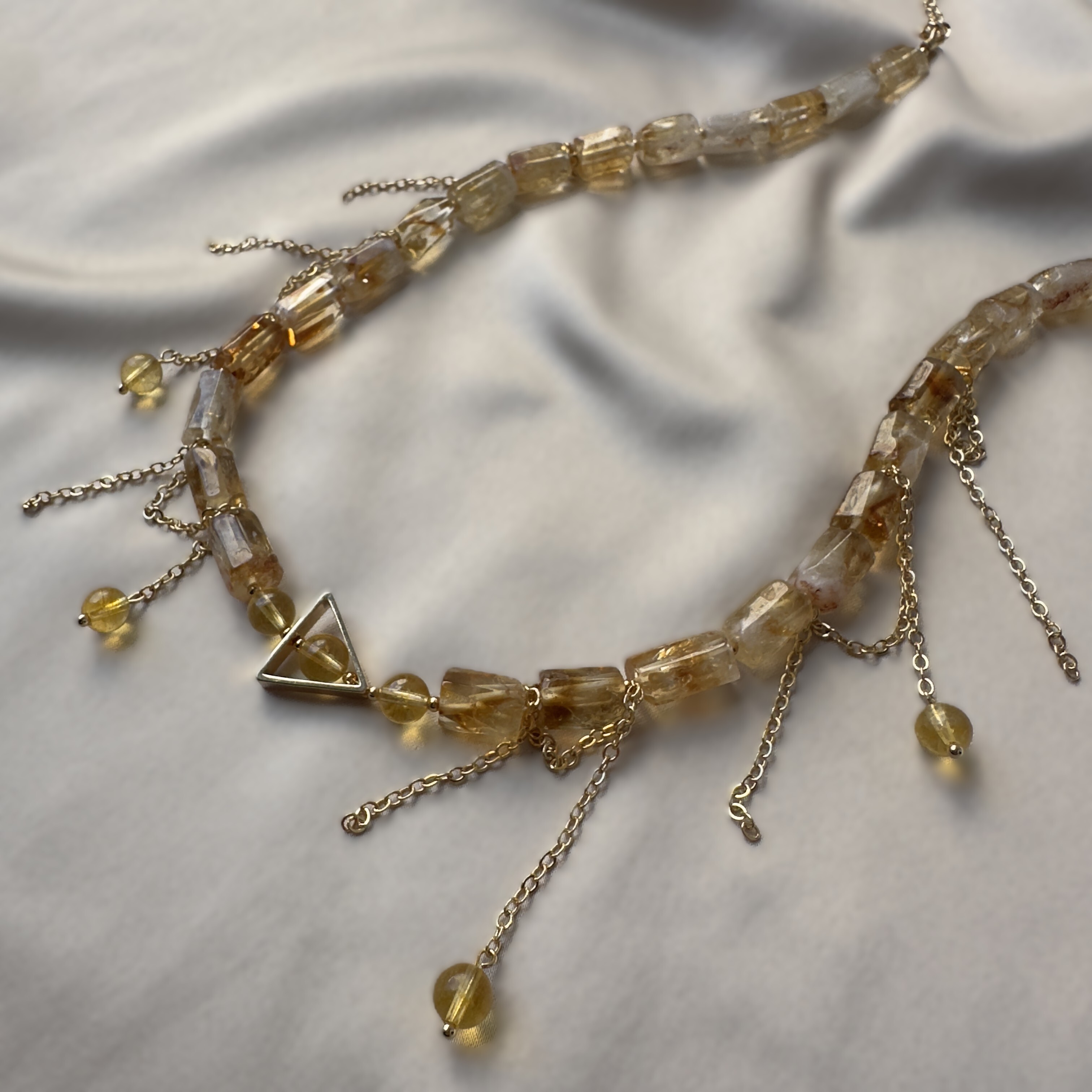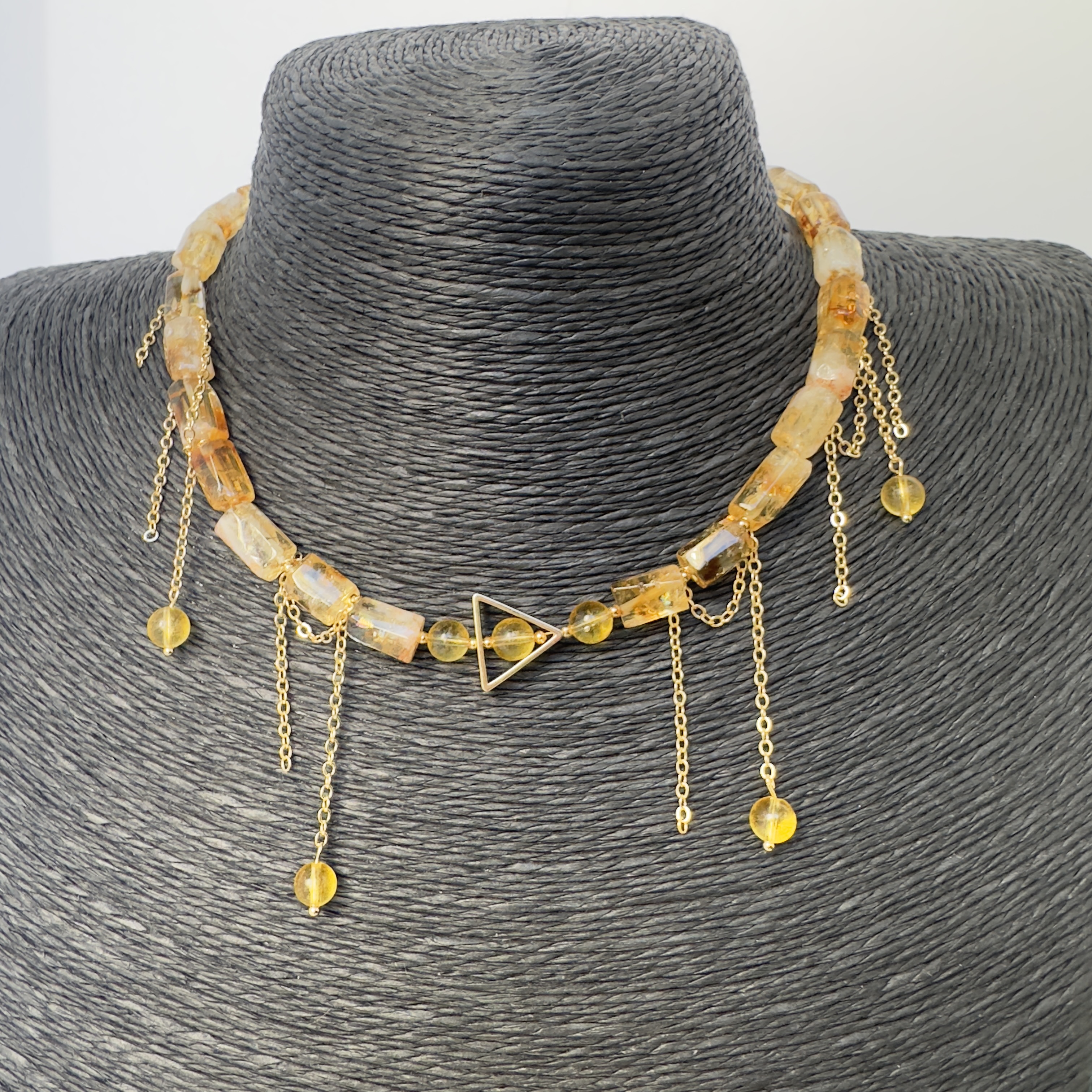 Состав и размеры: натуральный цитрин (кварц) — огранённые кубики/призмочки ≈6–9 мм; гладкие шарики-подвесы ≈6–8 мм; центральный геометрический элемент-треугольник (цвет золота); подвески-цепочки; фурнитура премиум (Корея). Длина по шее 40–45 см (удлинитель 5 см), замок-карабин.