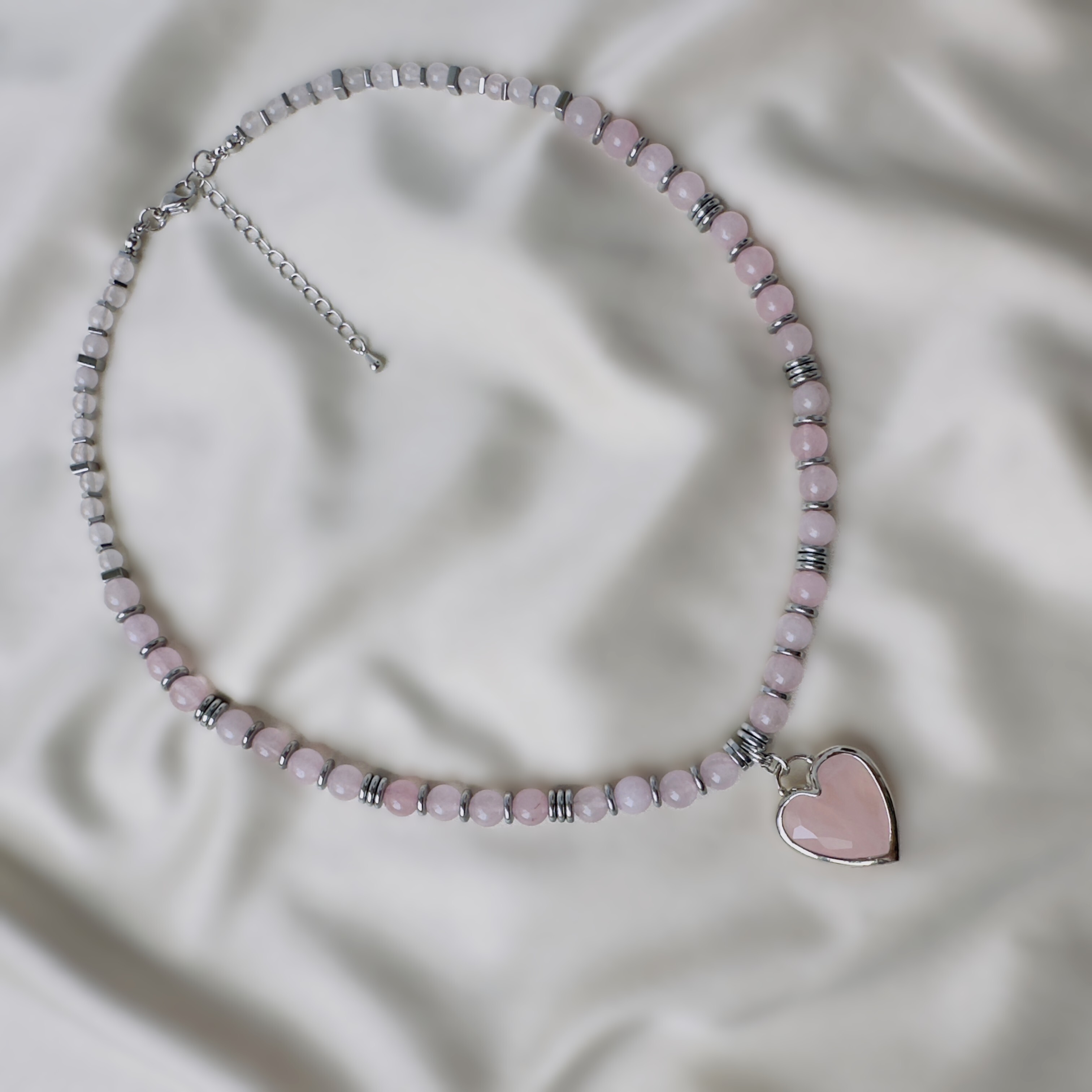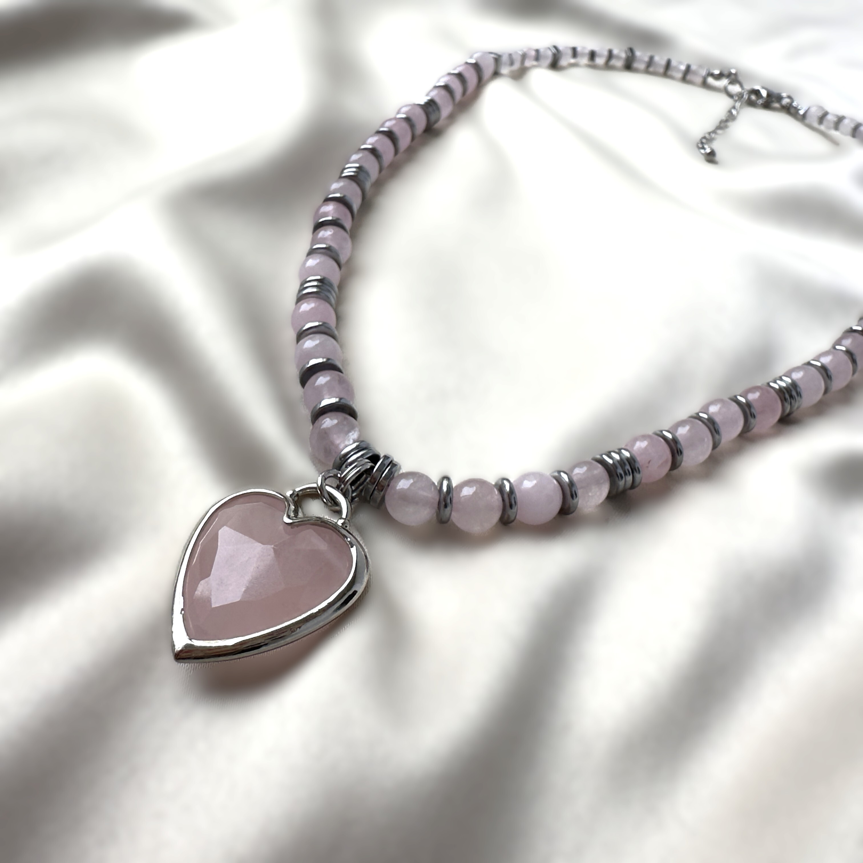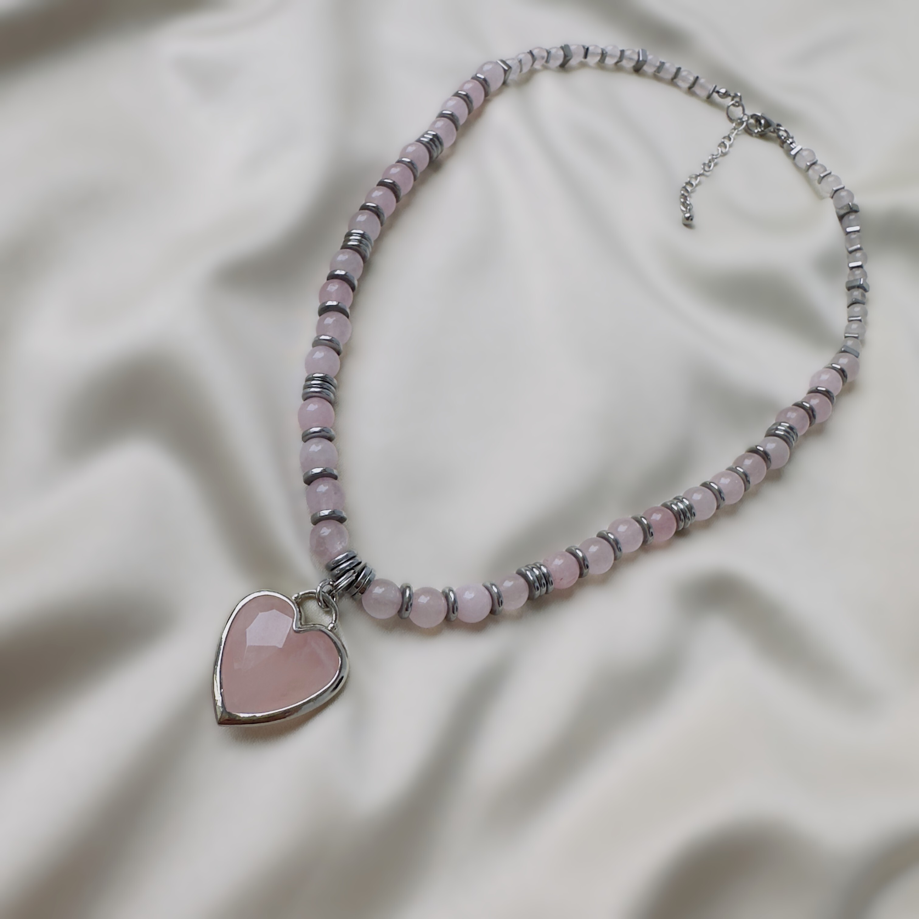 Длина 40 см, регулируемая (удлинительная цепочка 5 см). Бусины розового кварца чередуются с гематитовыми разделителями. Сердце - розовый кварц