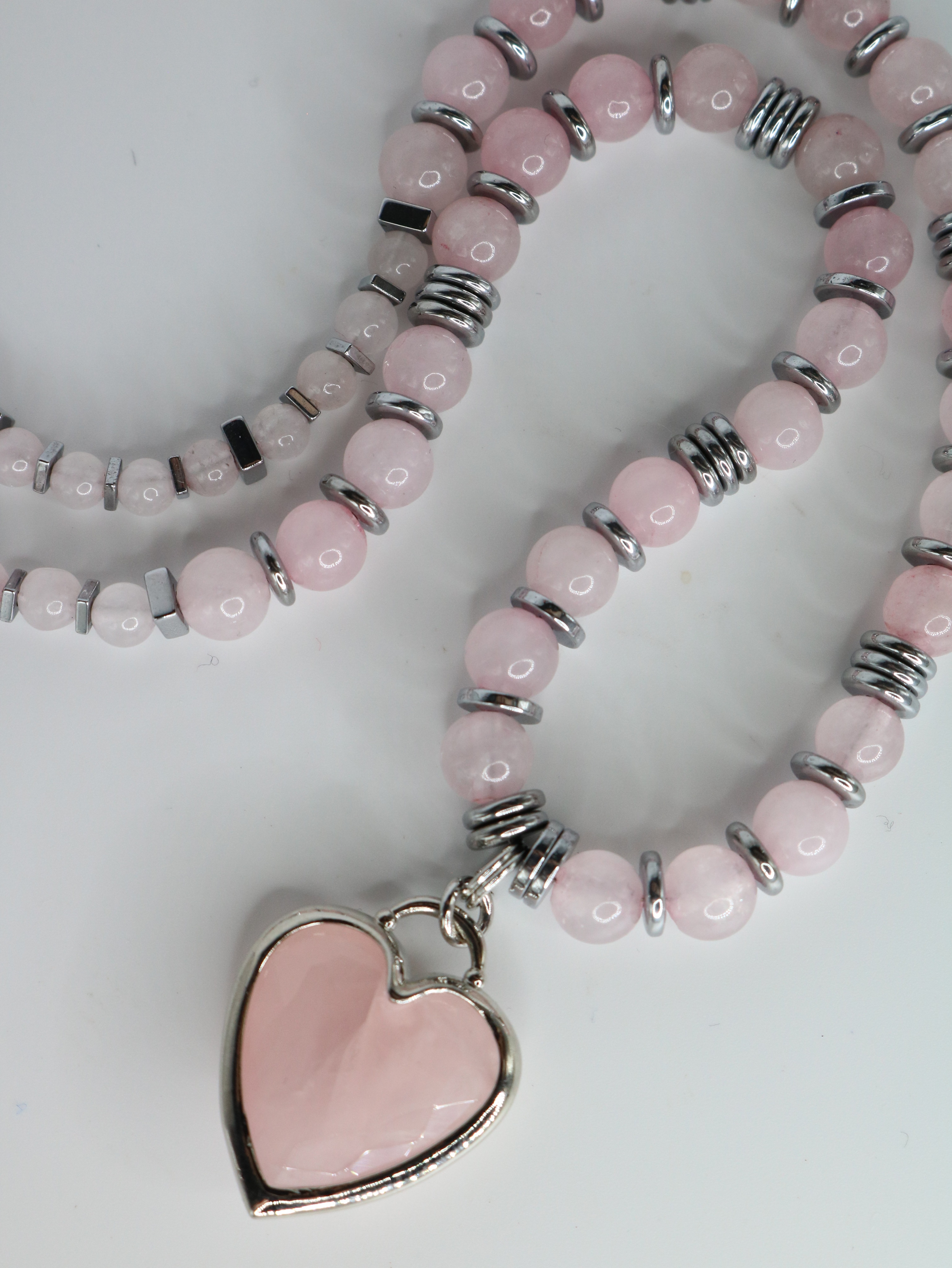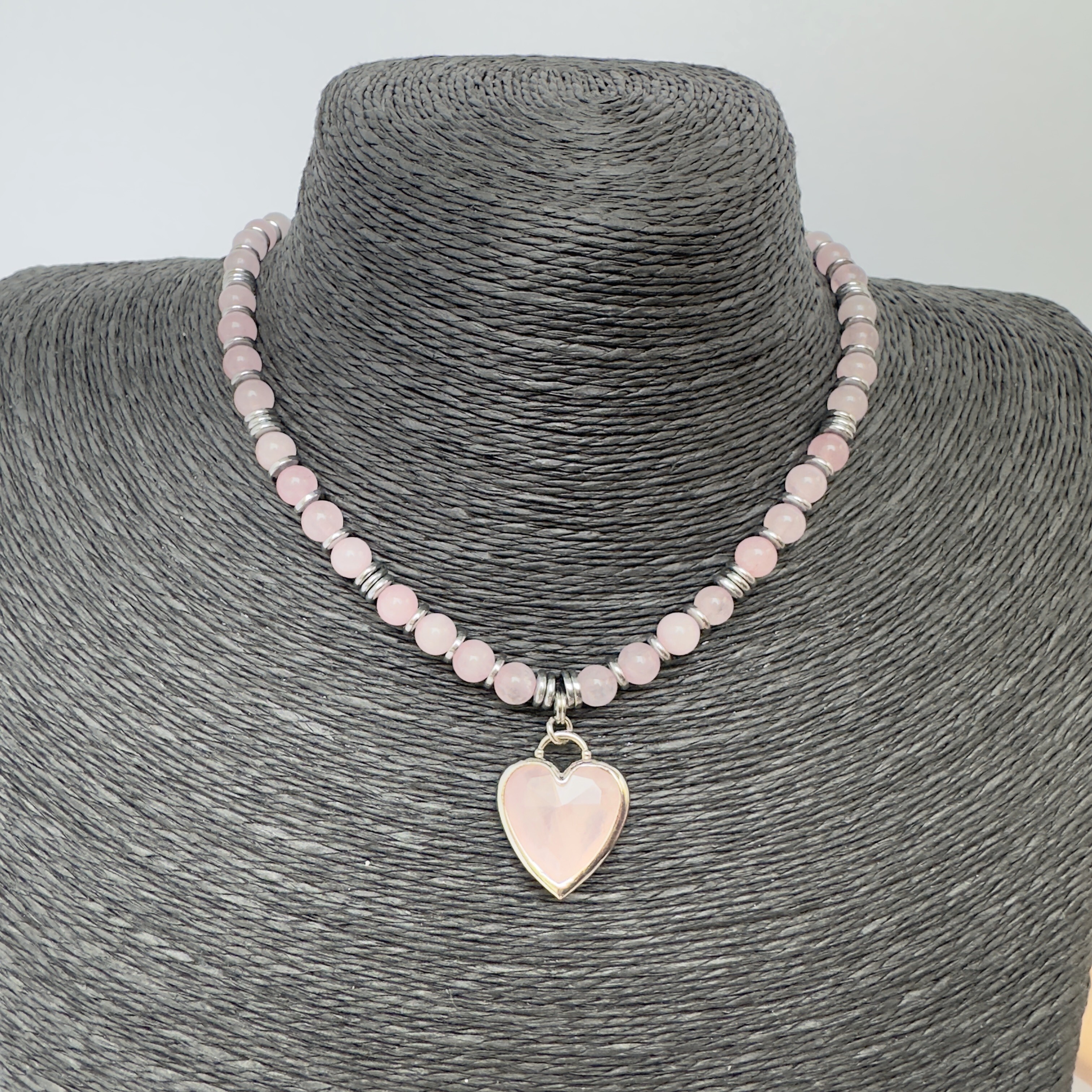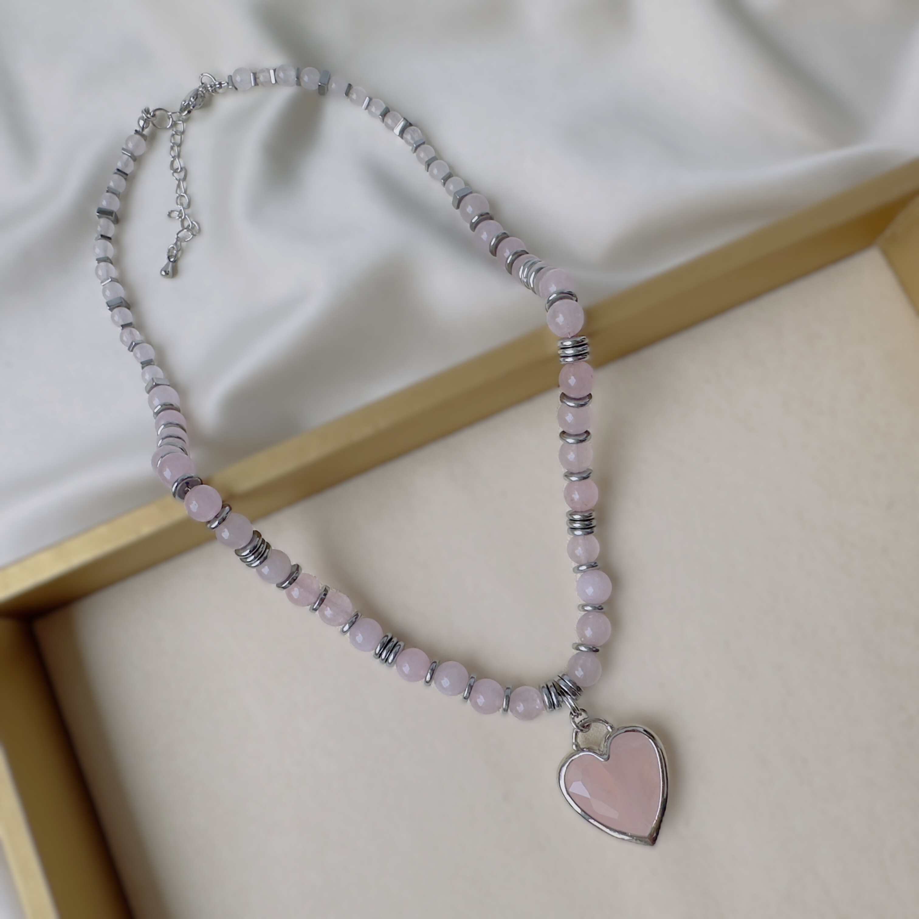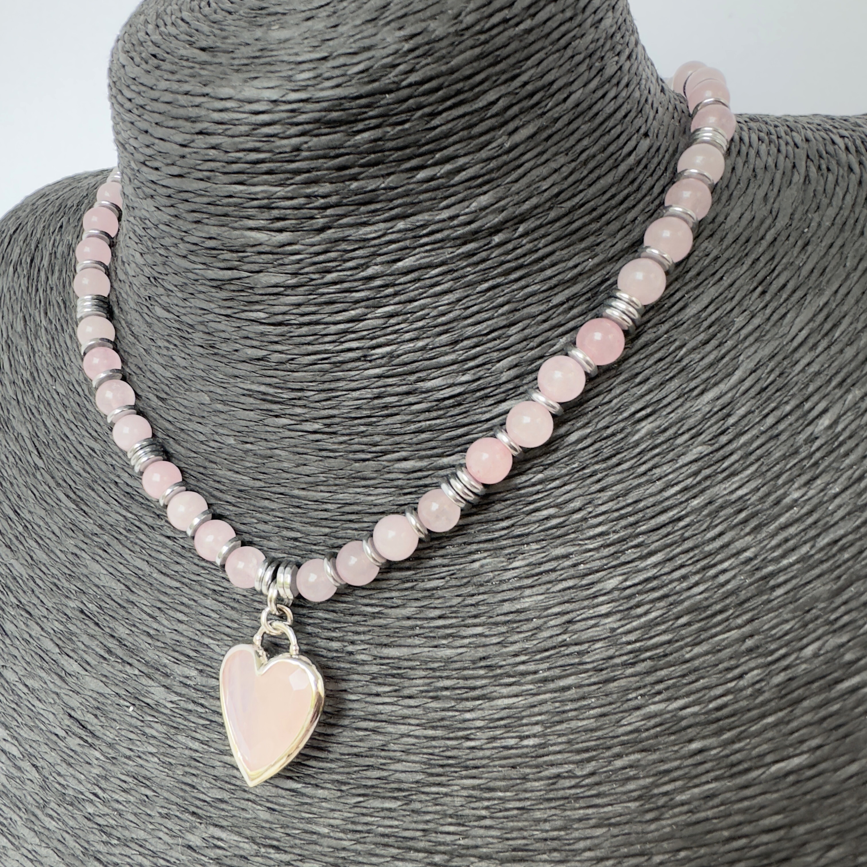 Длина 40 см, регулируемая (удлинительная цепочка 5 см). Бусины розового кварца чередуются с гематитовыми разделителями. Сердце - розовый кварц