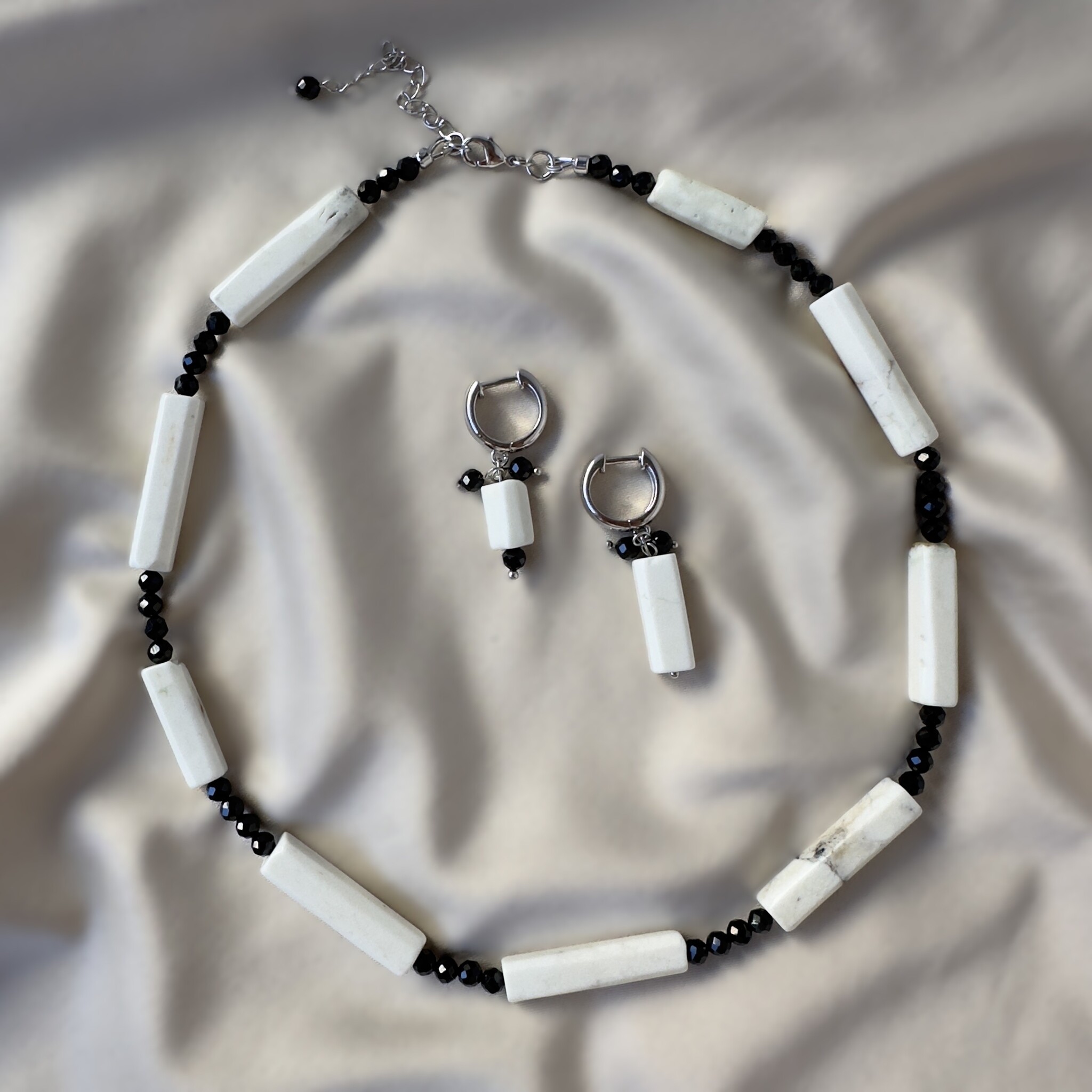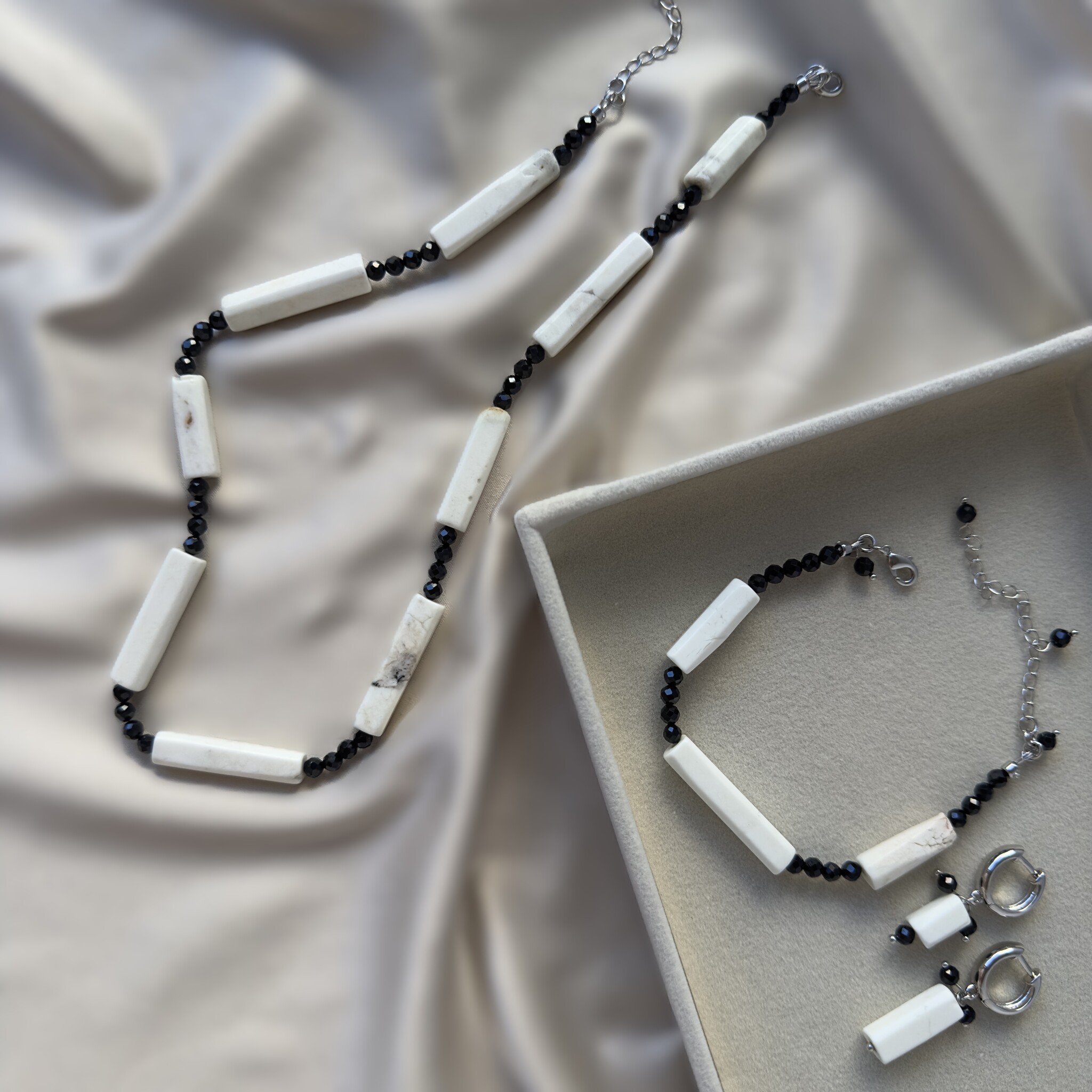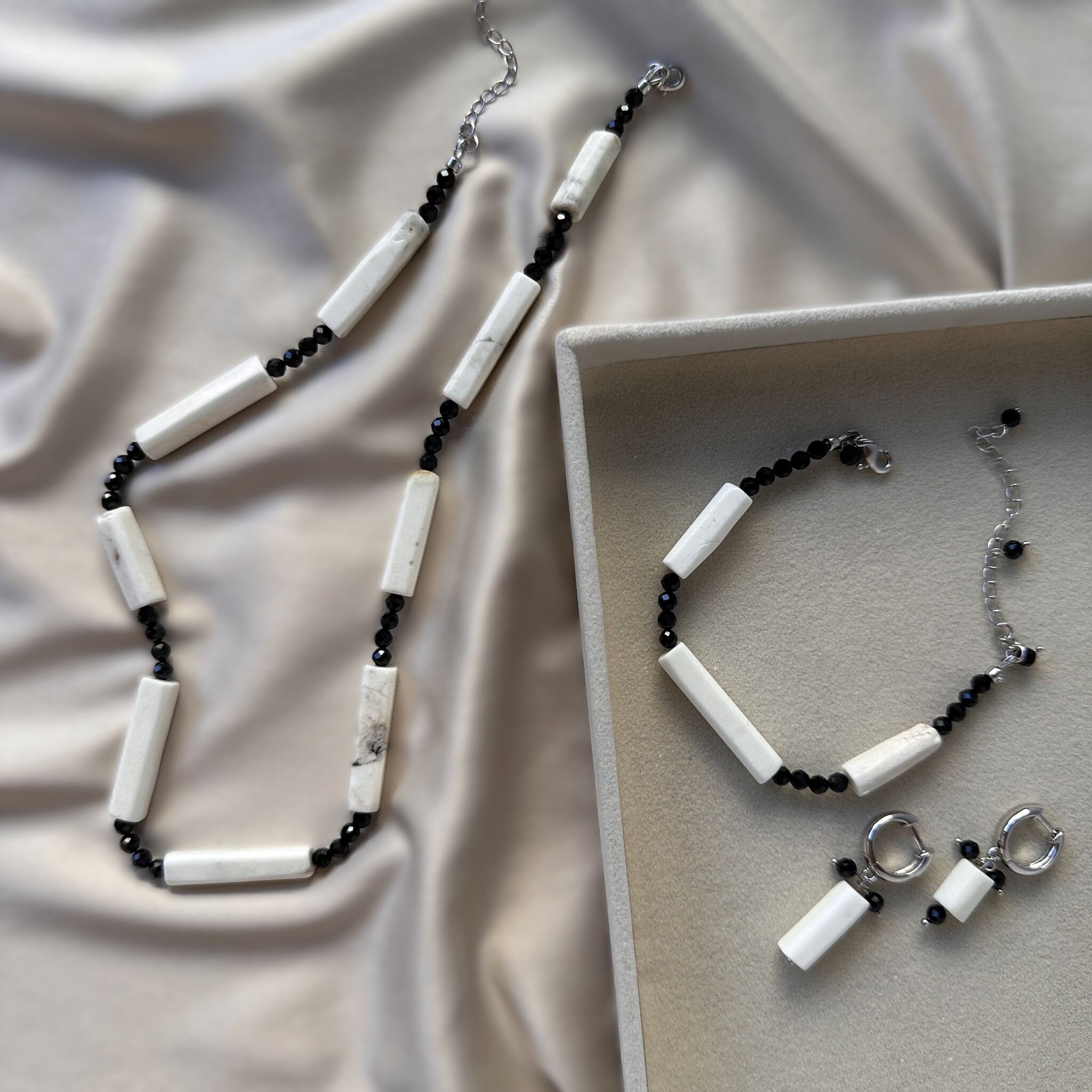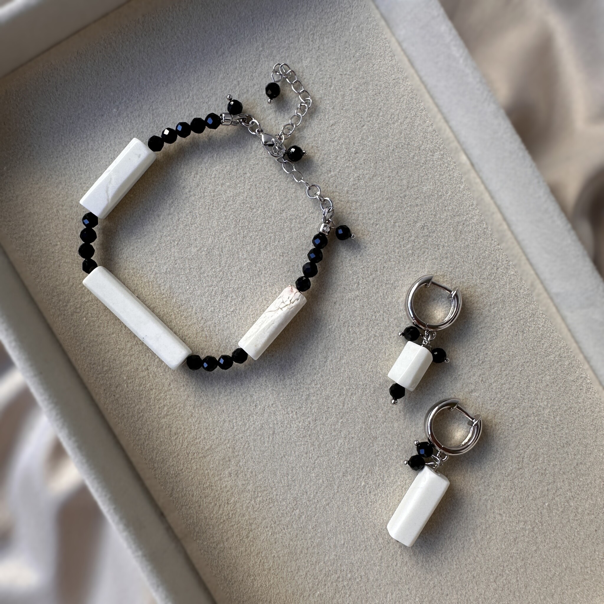 Белый камень издавна считался символом мудрости и защиты, а чёрный — силы и решимости. В паре они создают союз, где женственность и мягкость переплетаются с характером и уверенностью.