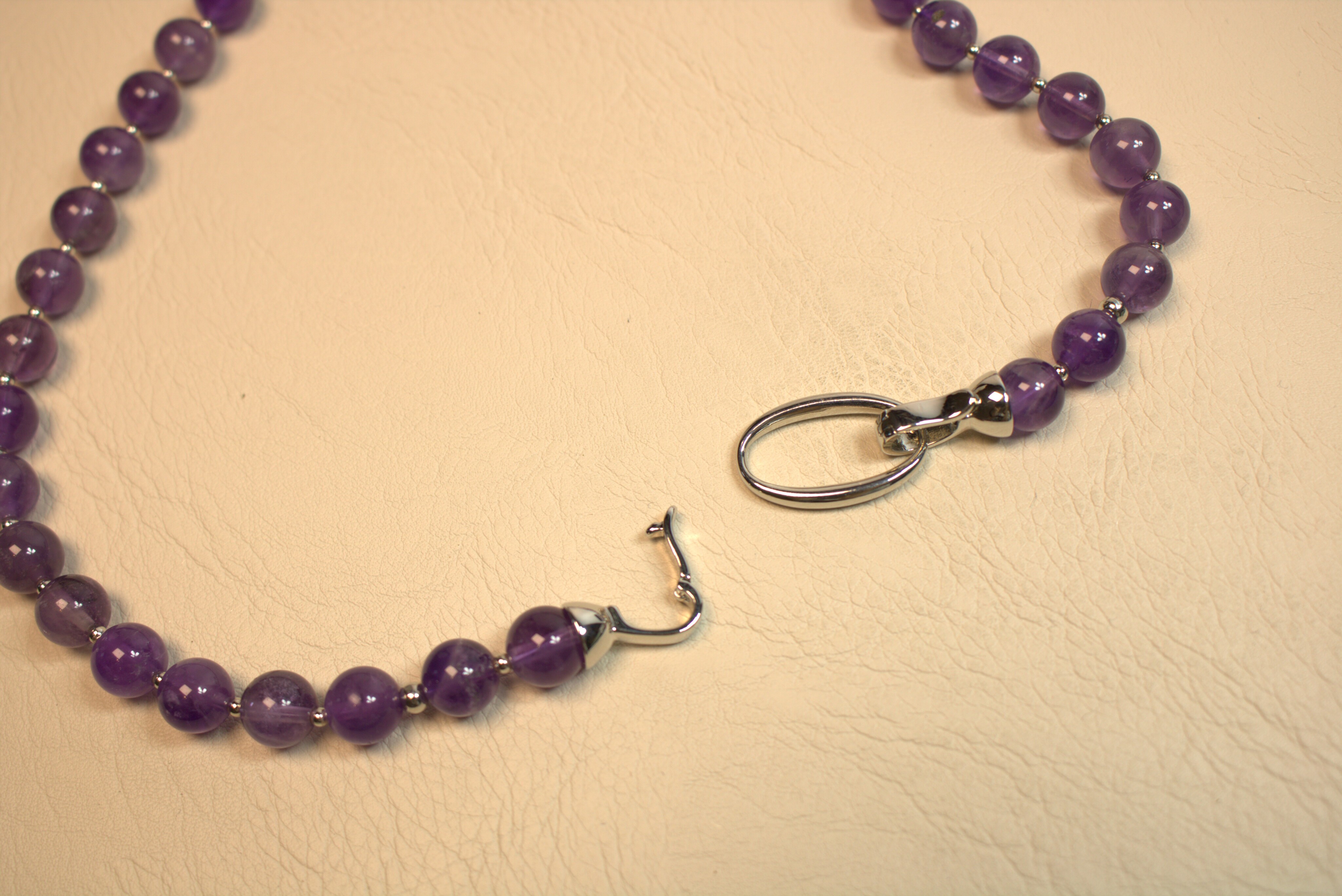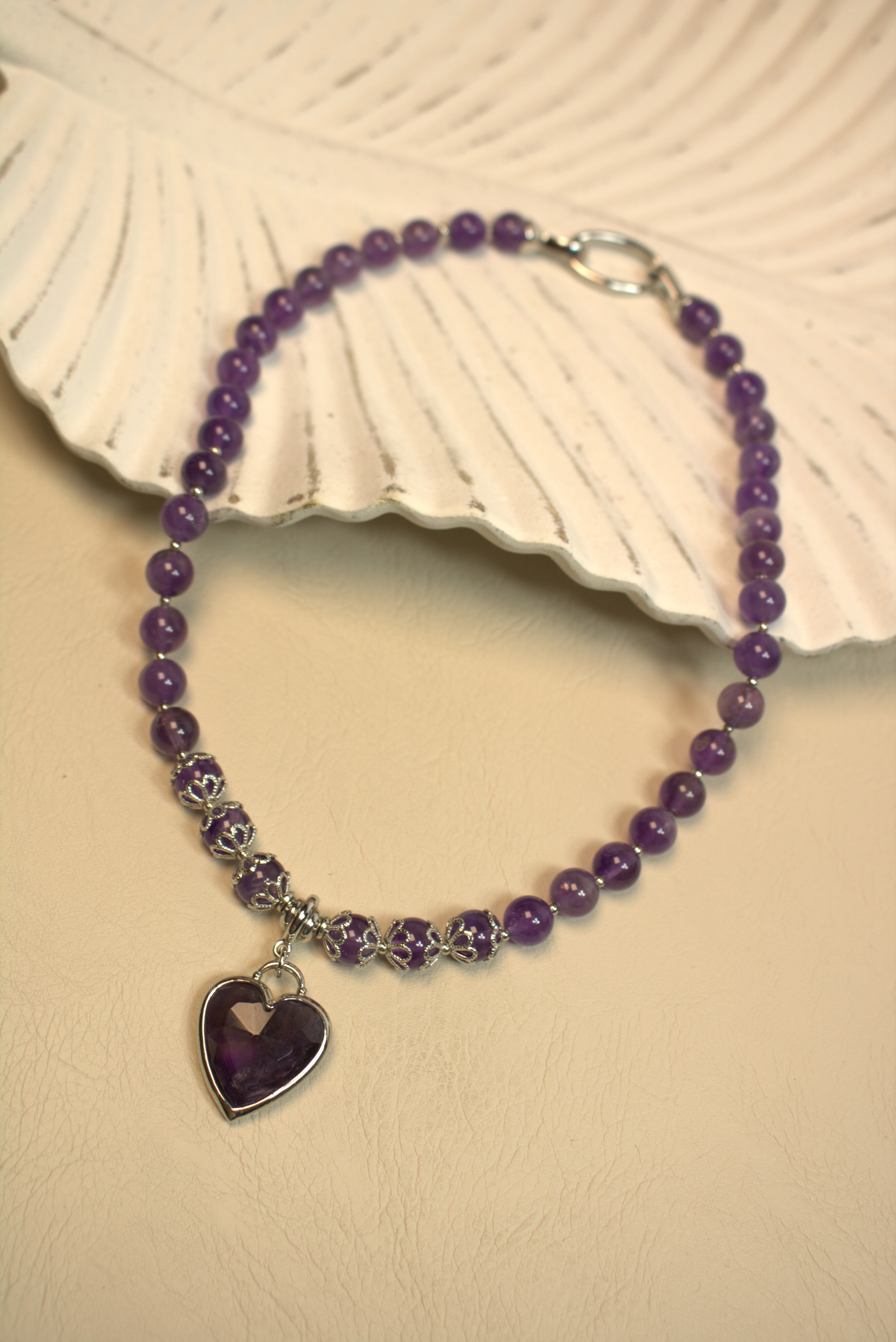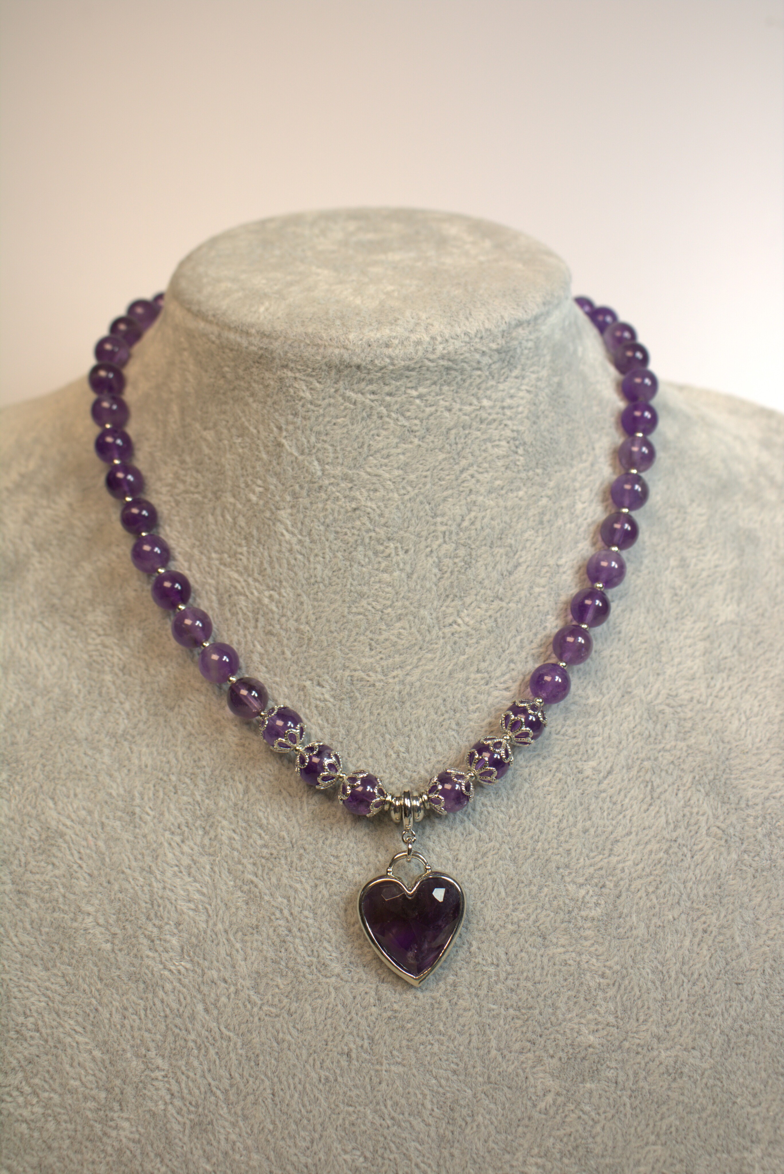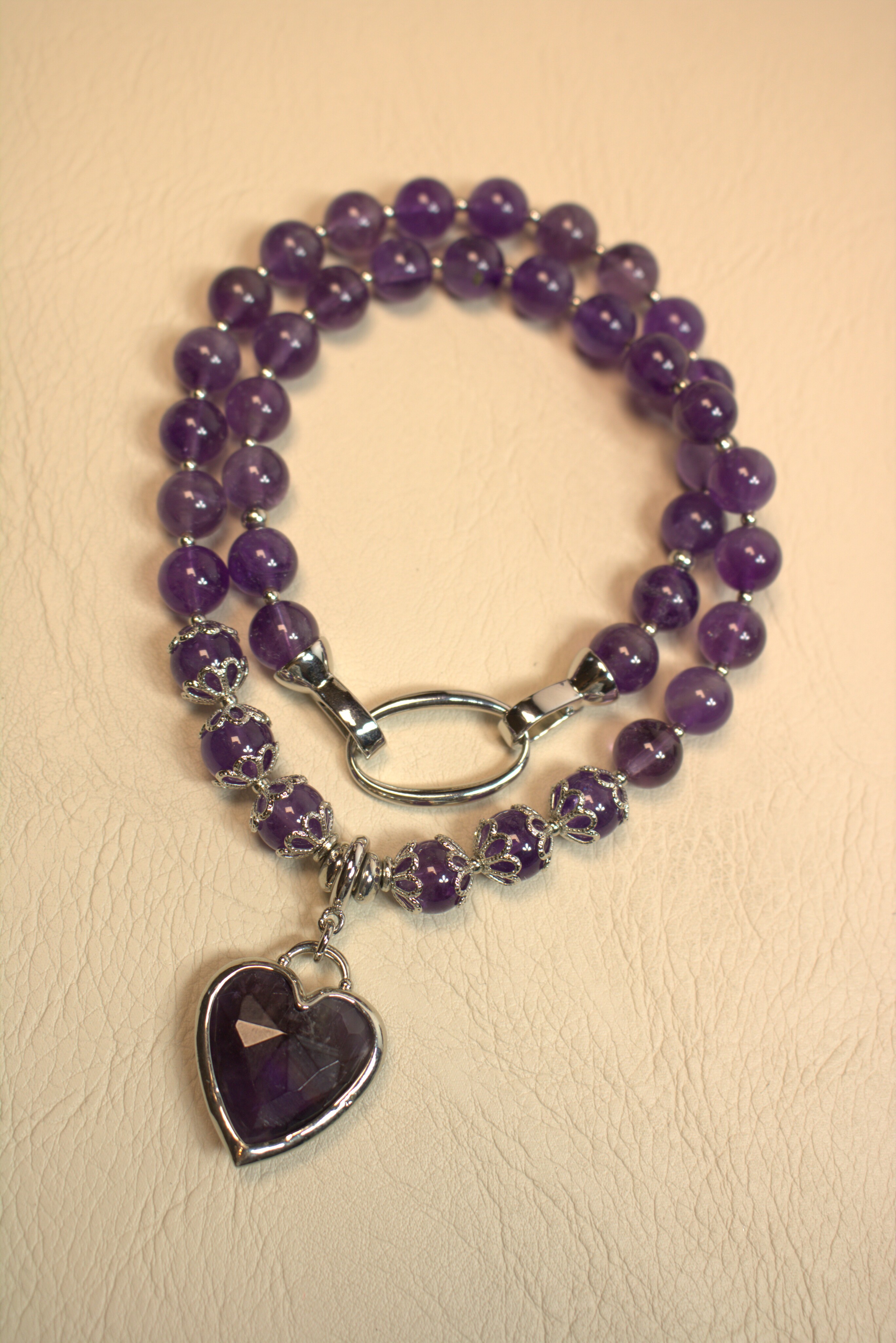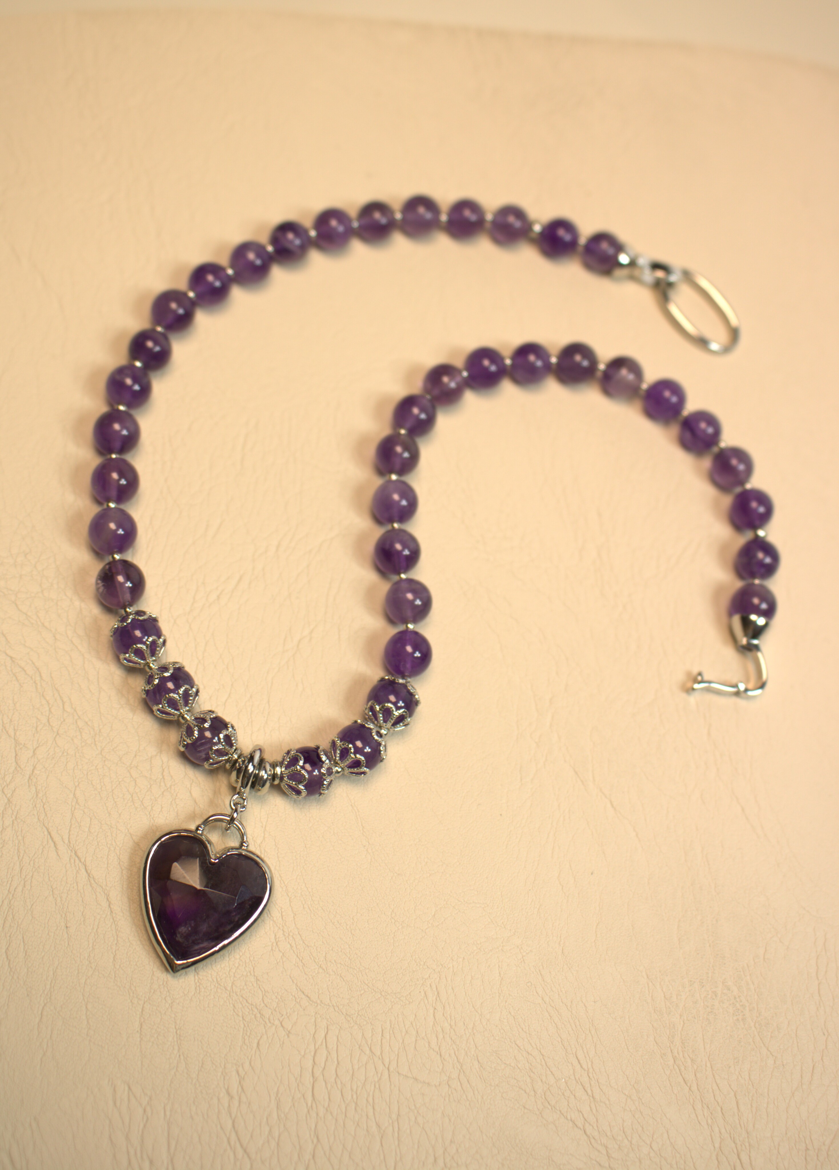 Насыщенный фиолетовый аметист в аккуратных бусинах 8 мм и крупное гранёное сердце — украшение, которое сразу притягивает взгляд к области декольте. Колье смотрится объемно и при этом очень аккуратно, за счёт благородного блеска камня и лаконичной металлической фурнитуры.