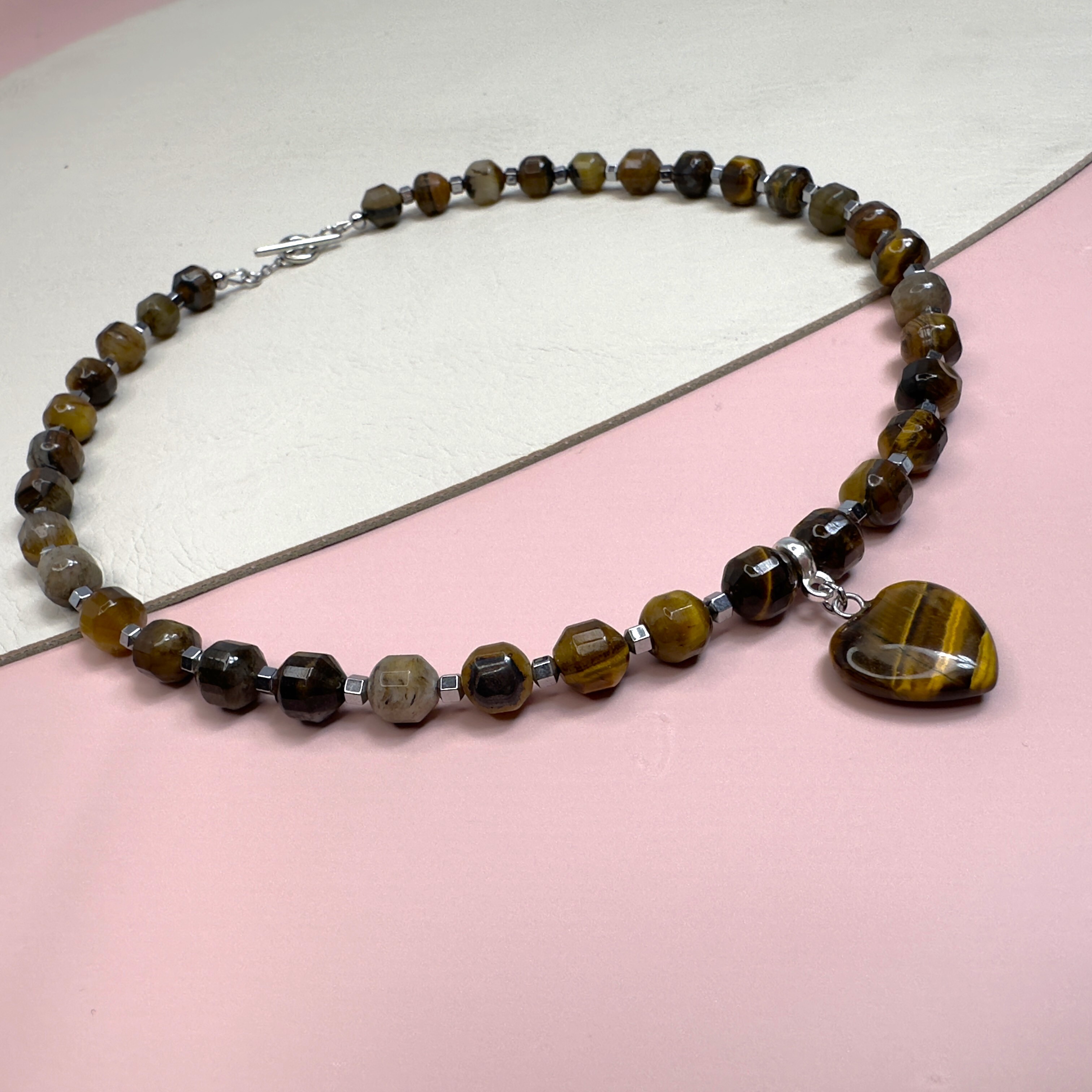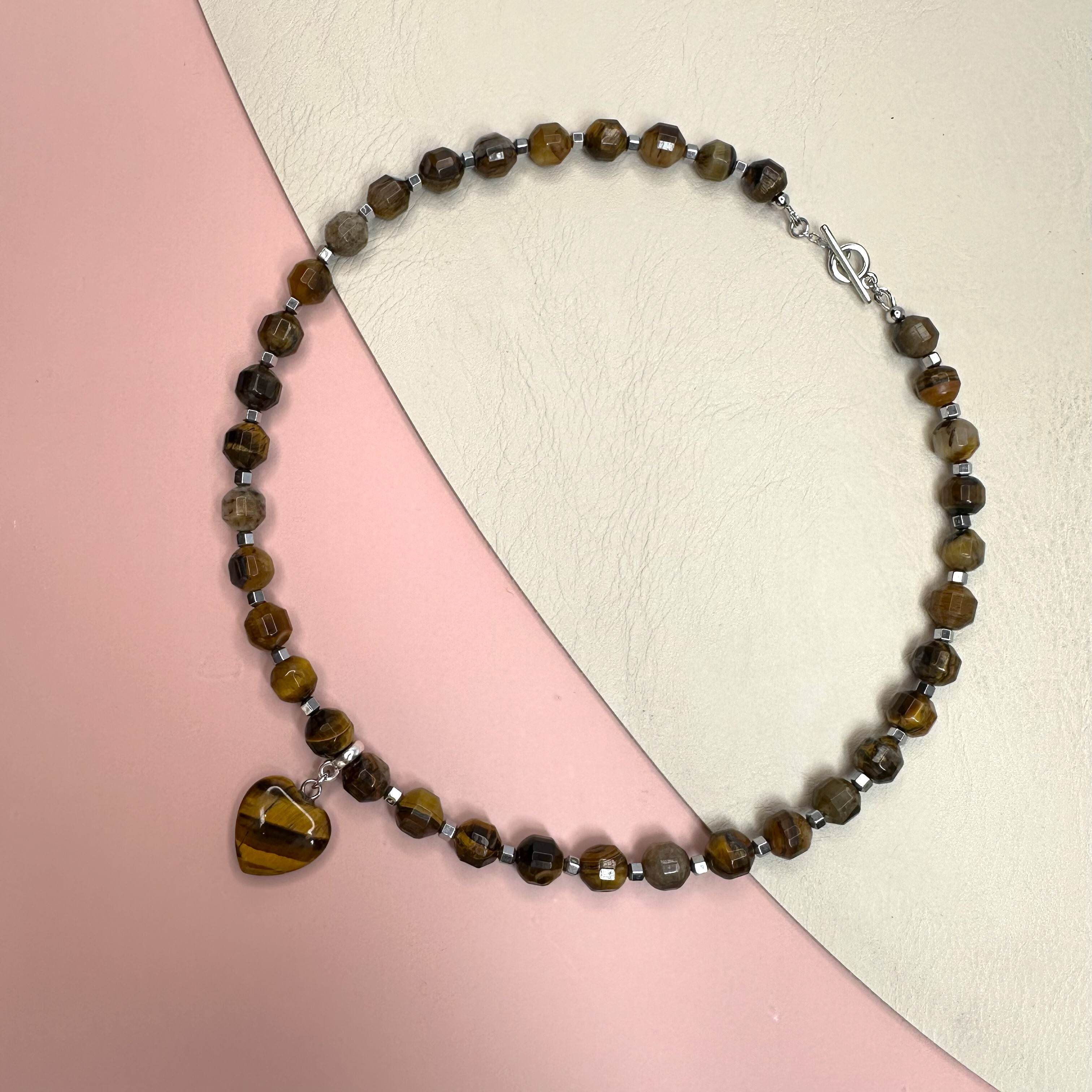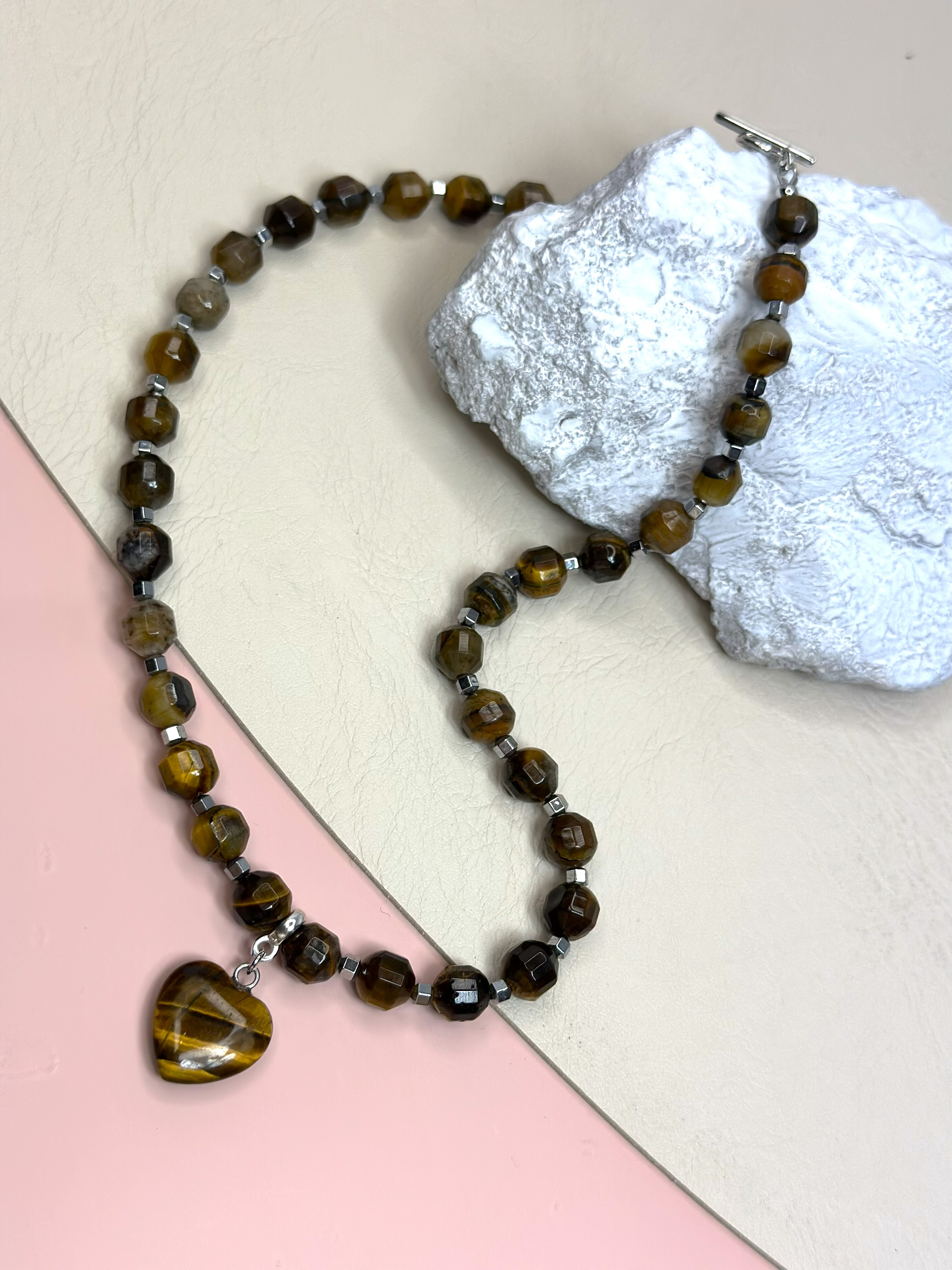 Материалы: натуральный тигровый глаз (фасет 8 мм + подвеска-сердце 20х20 мм), гематитовые проставки 4х4 мм, фурнитура под серебро (Южная Корея), застёжка-тогл диаметр 1 см.