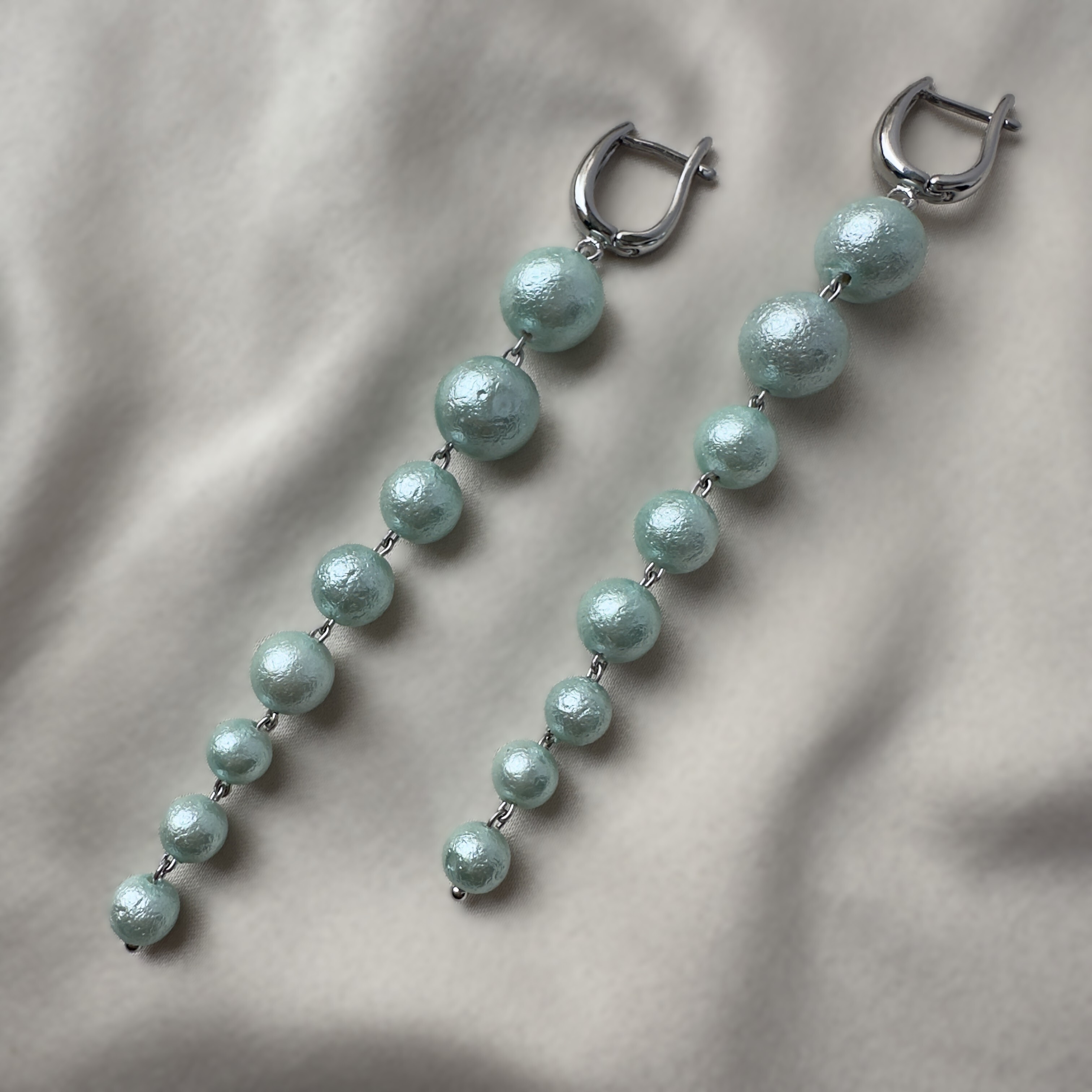 Вечерние серьги из жемчуг майорка (градация бусин ~6–10 мм); фурнитура под серебро (Южная Корея); английский замок.