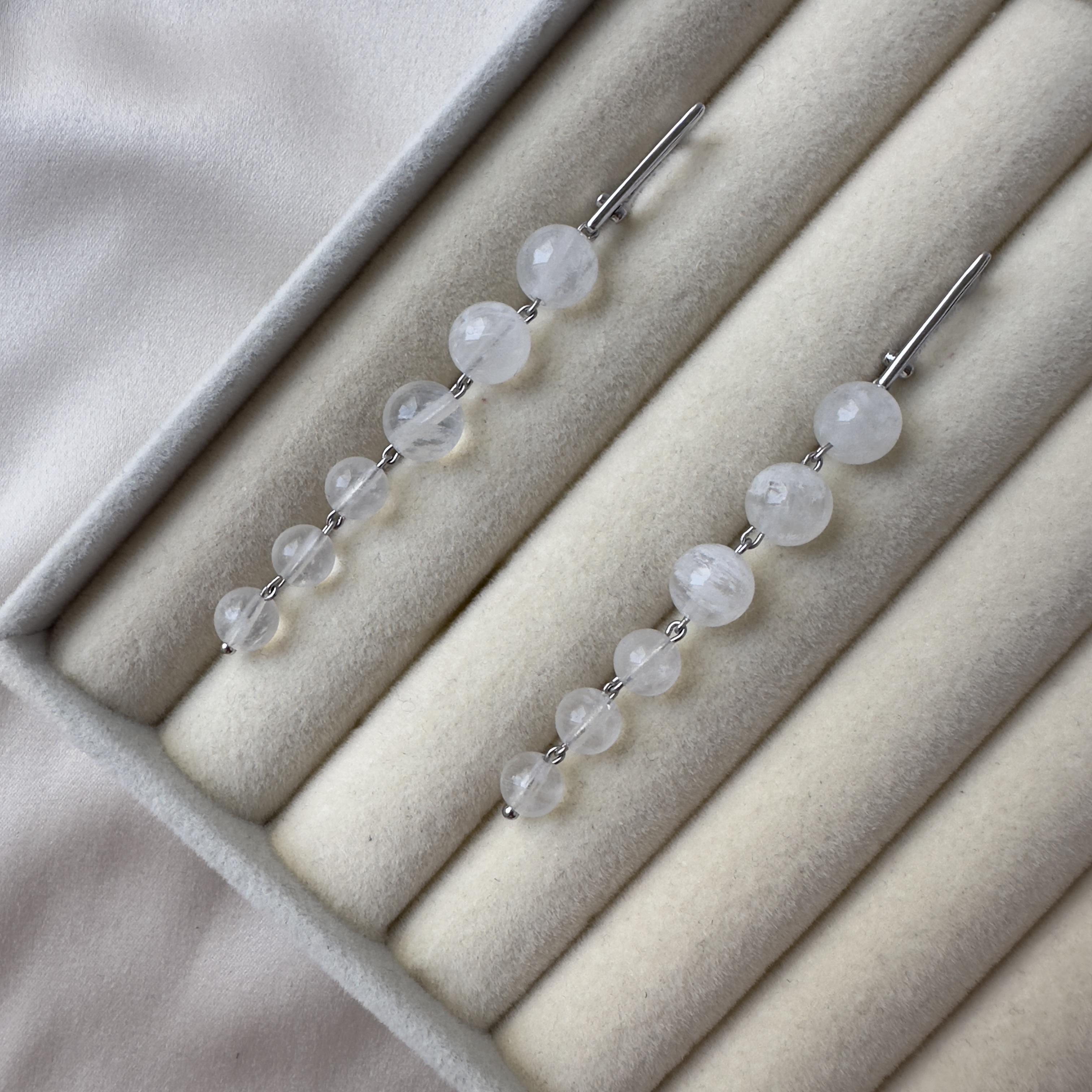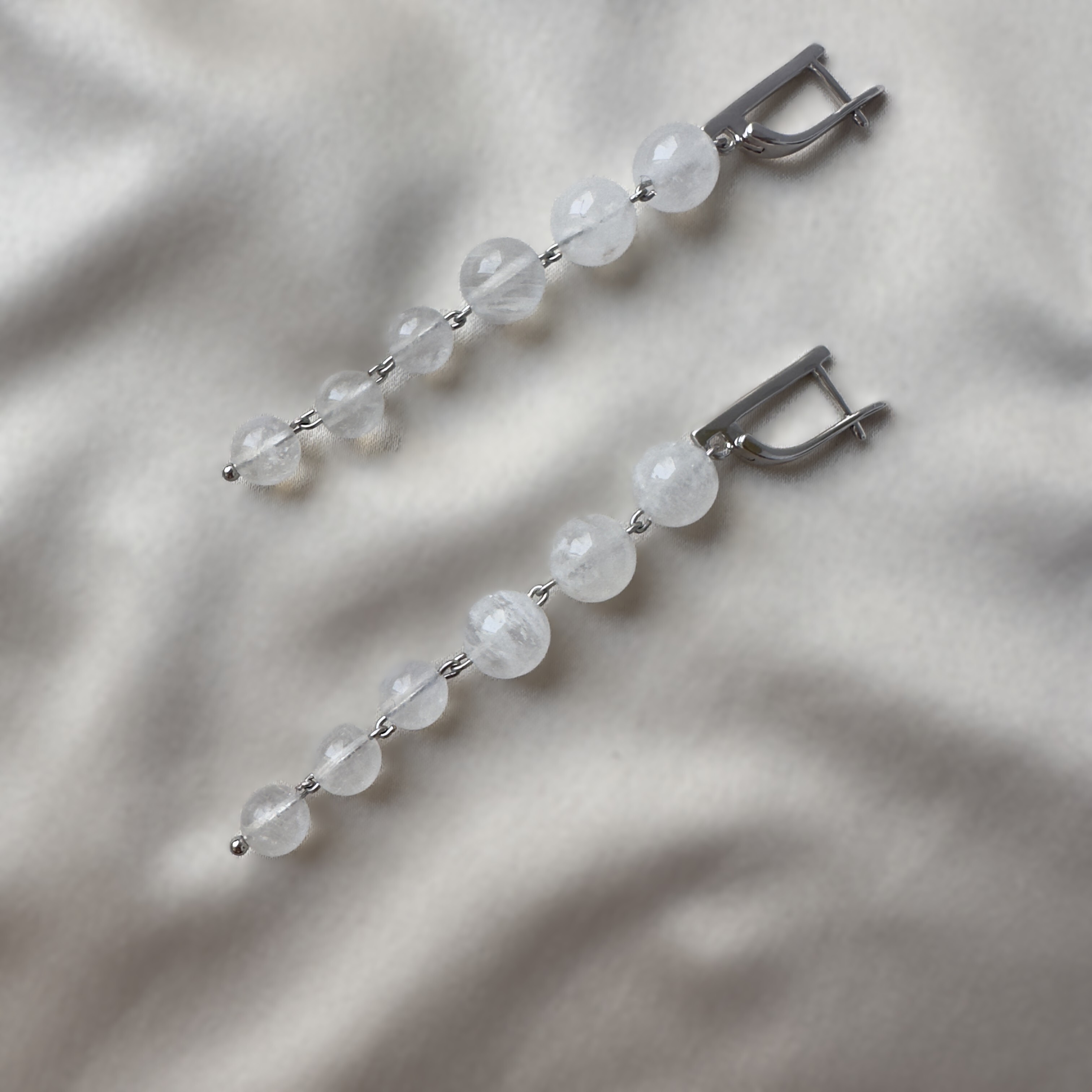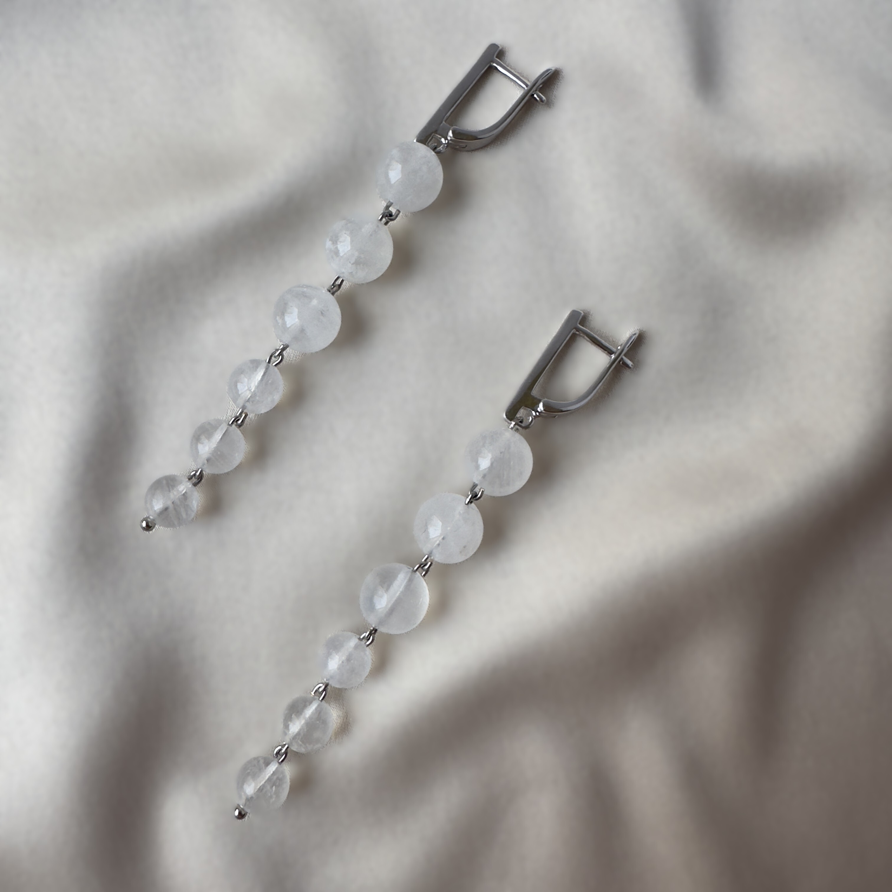 Длинные серьги-подвески из натурального адуляра (лунный камень) на серебристой фурнитуре. Длина подвеса ≈ 6 см, аккуратный блеск адуляресценции. «Твой талисман в мире побед».