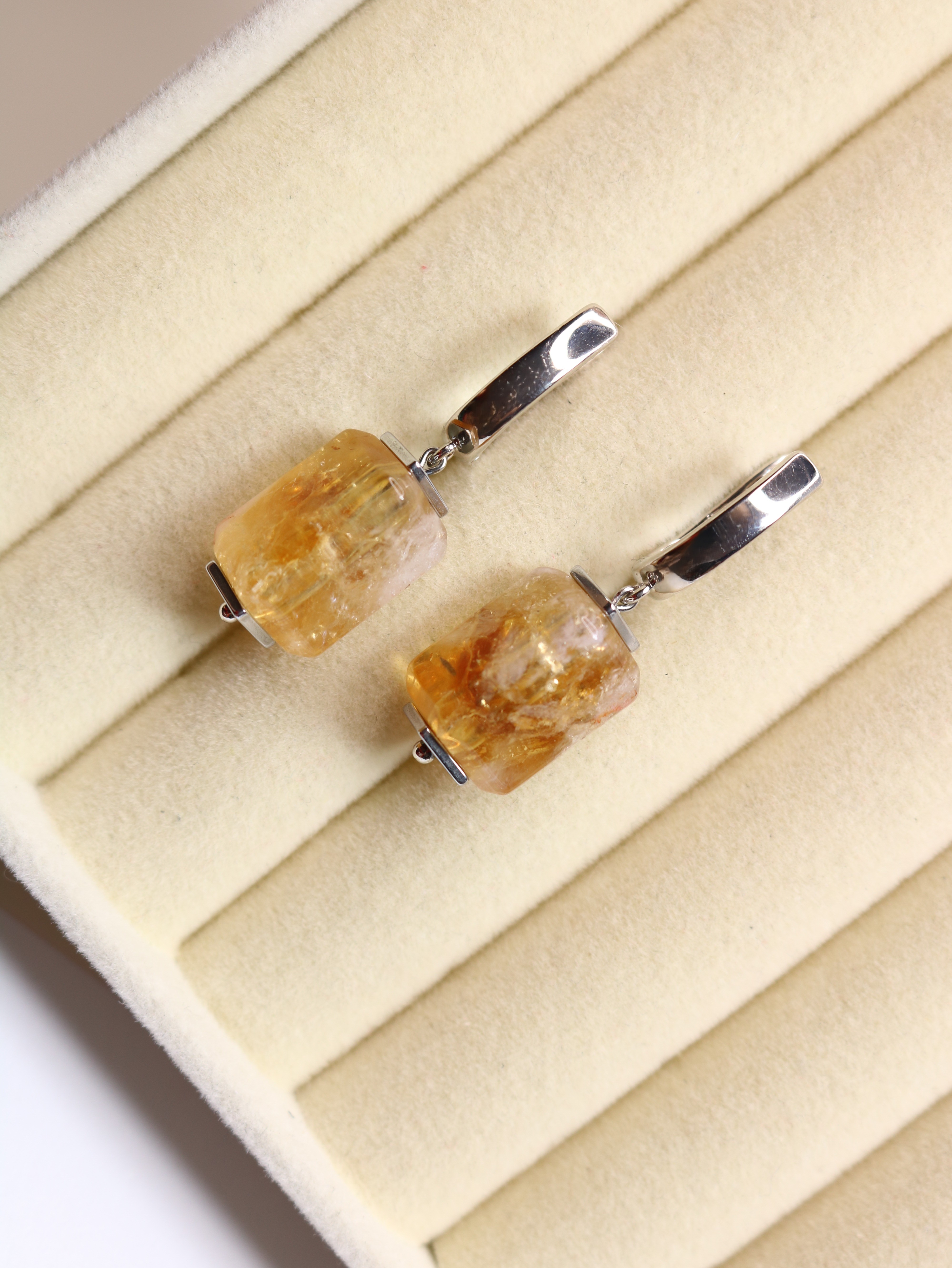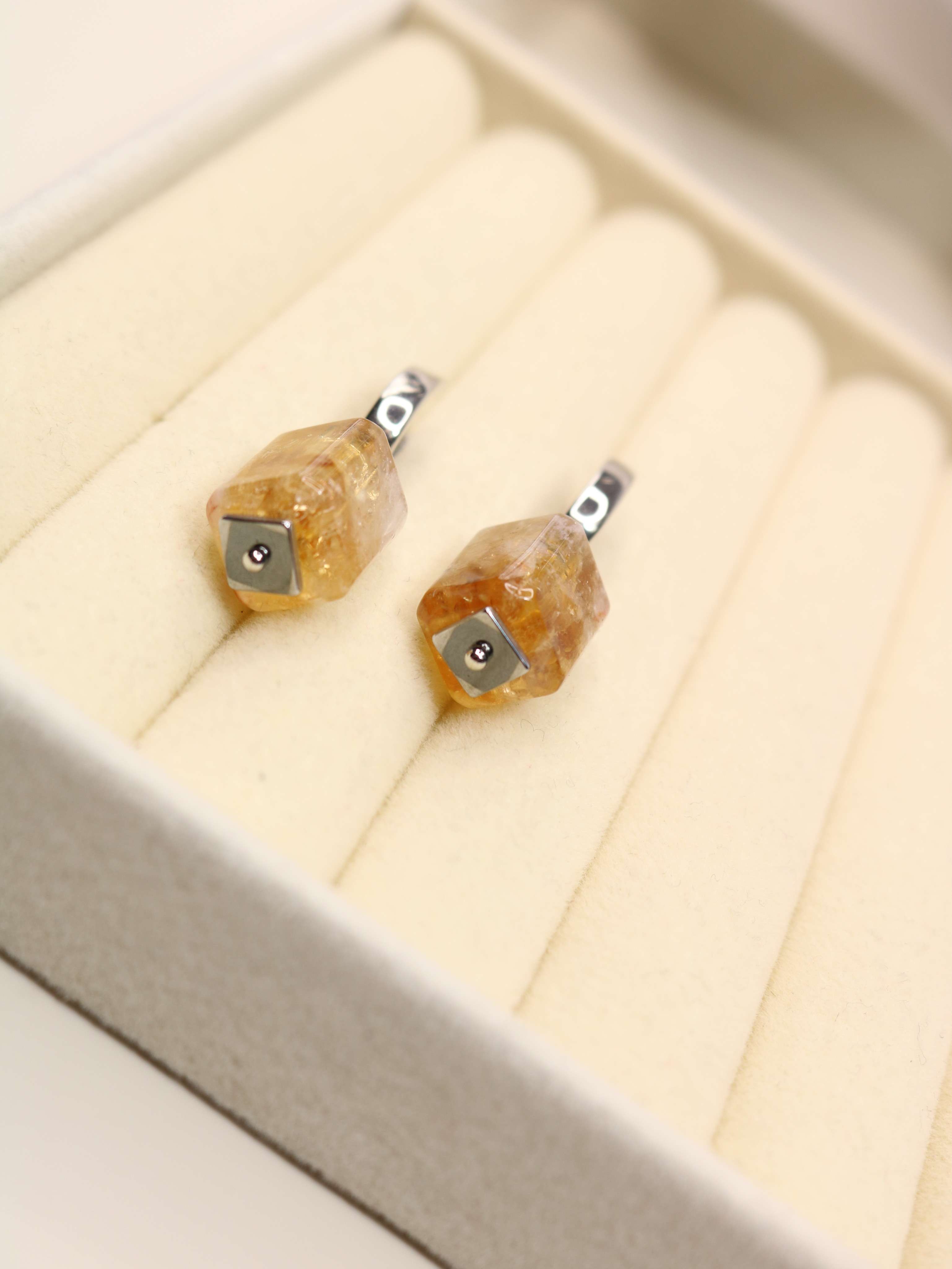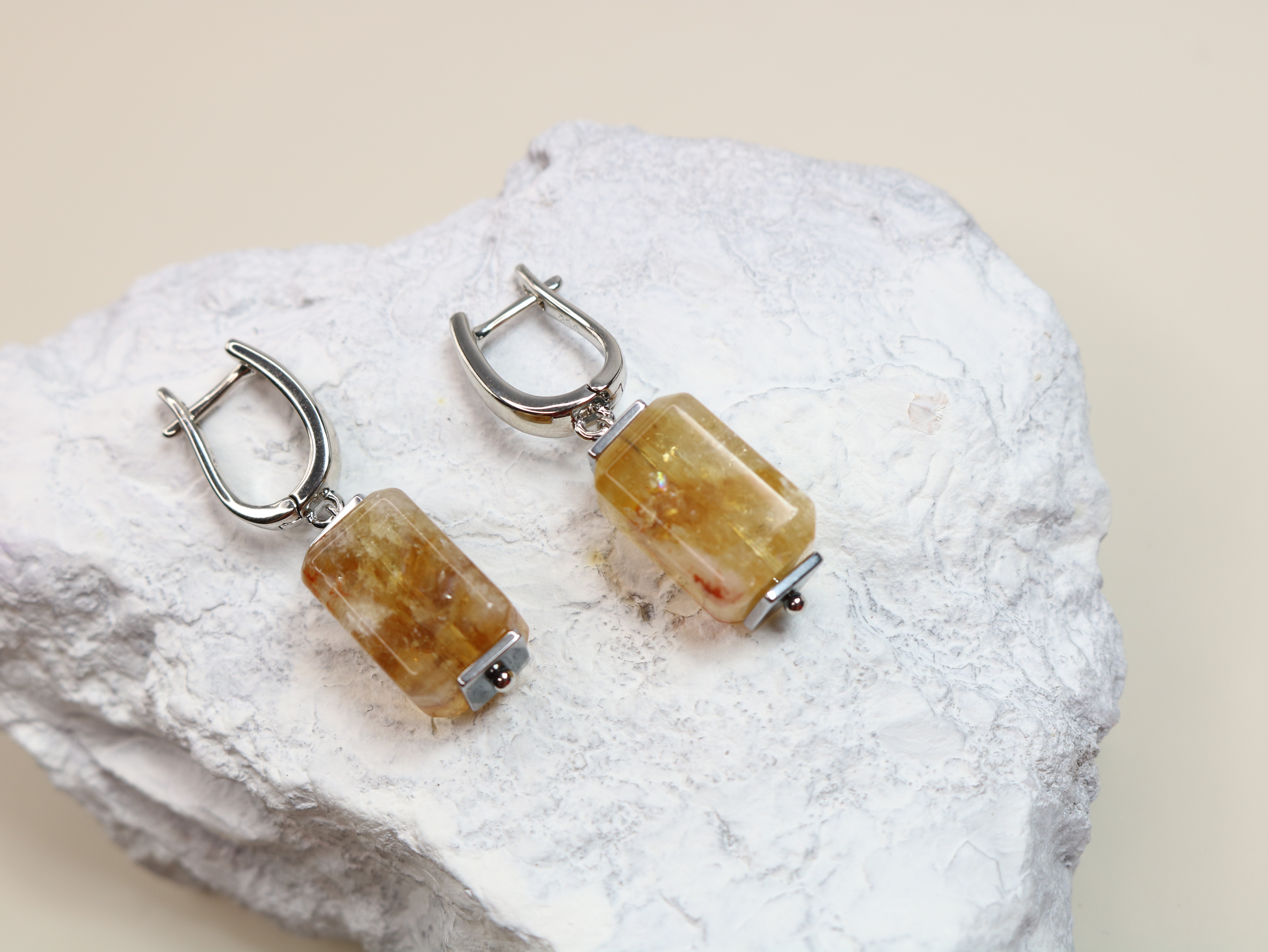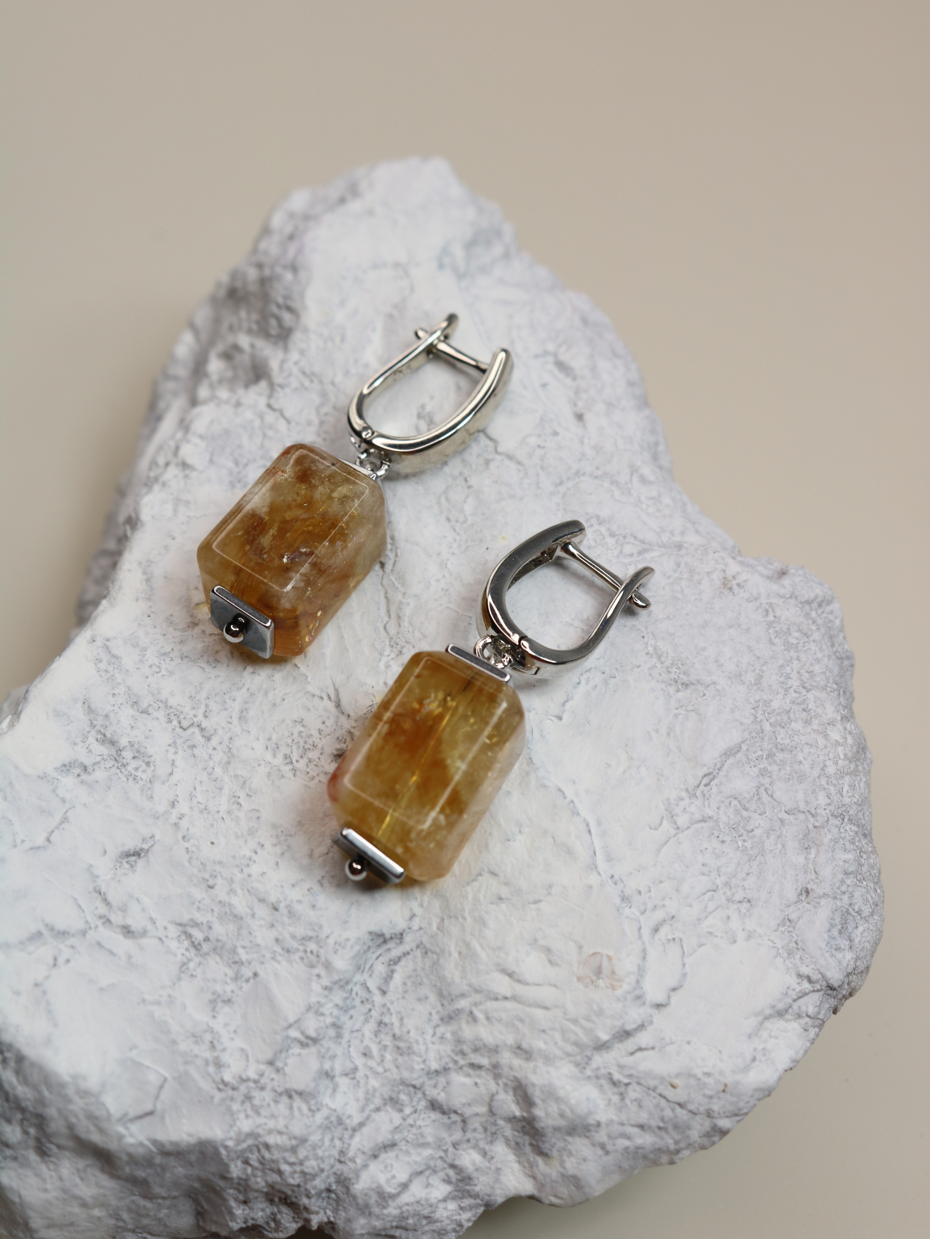 Материалы — честно: натуральный цитрин; допускаются природные нюансы тона и рисунка, лёгкая иризация — те самые радужные блики внутри кристалла.
