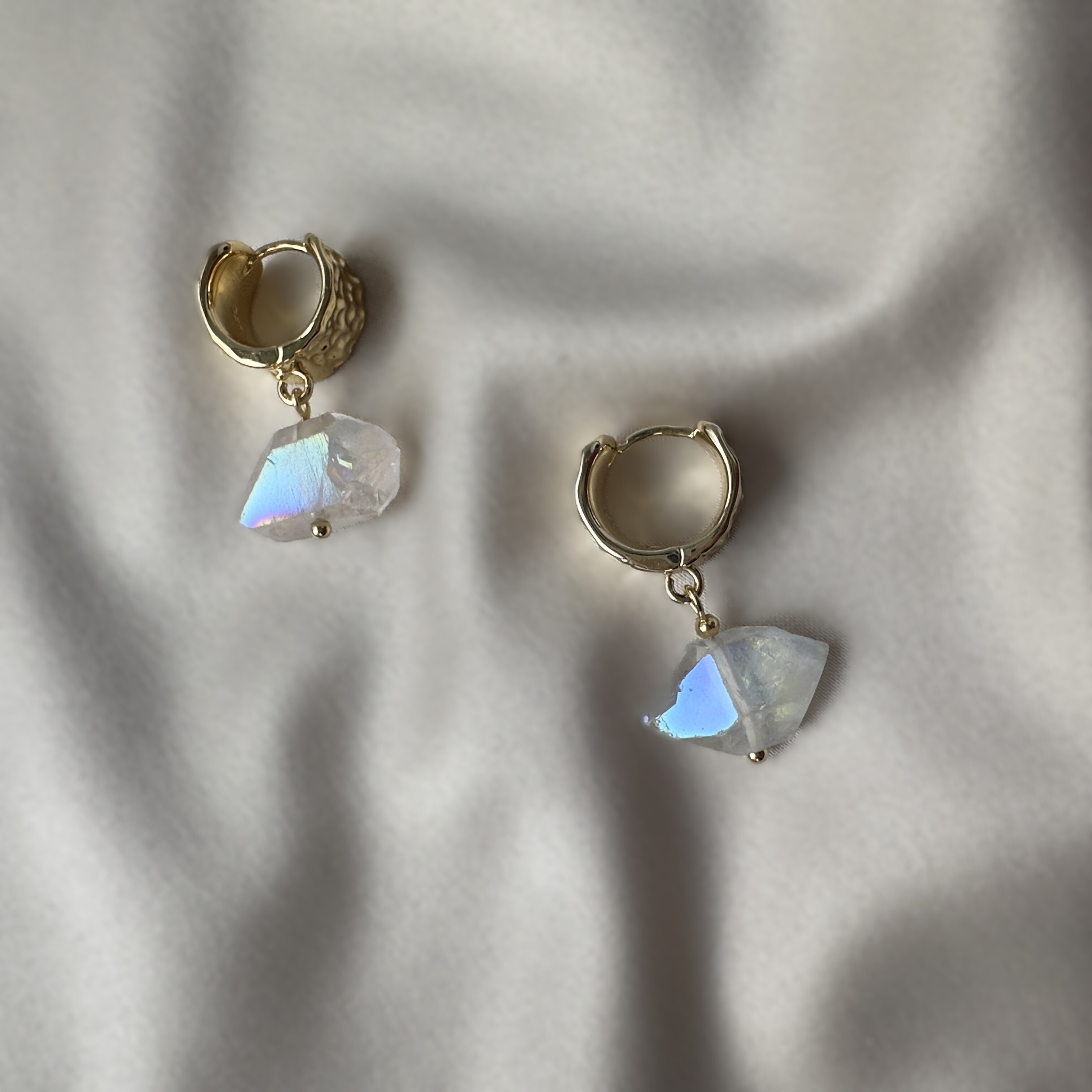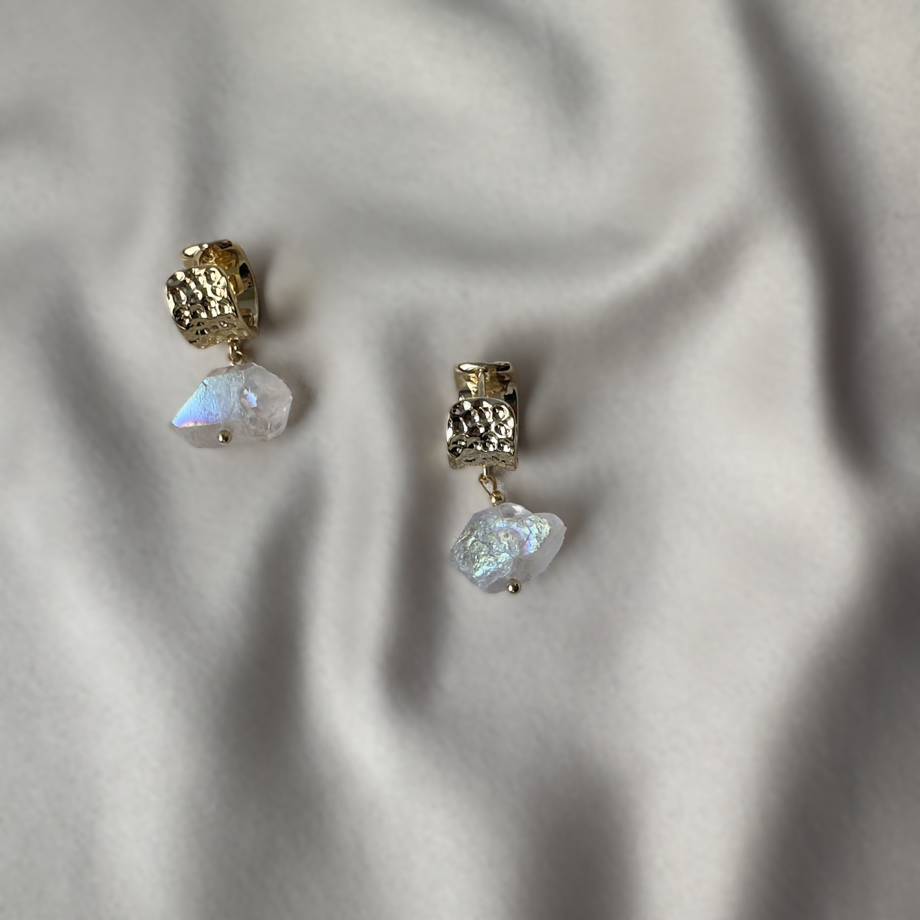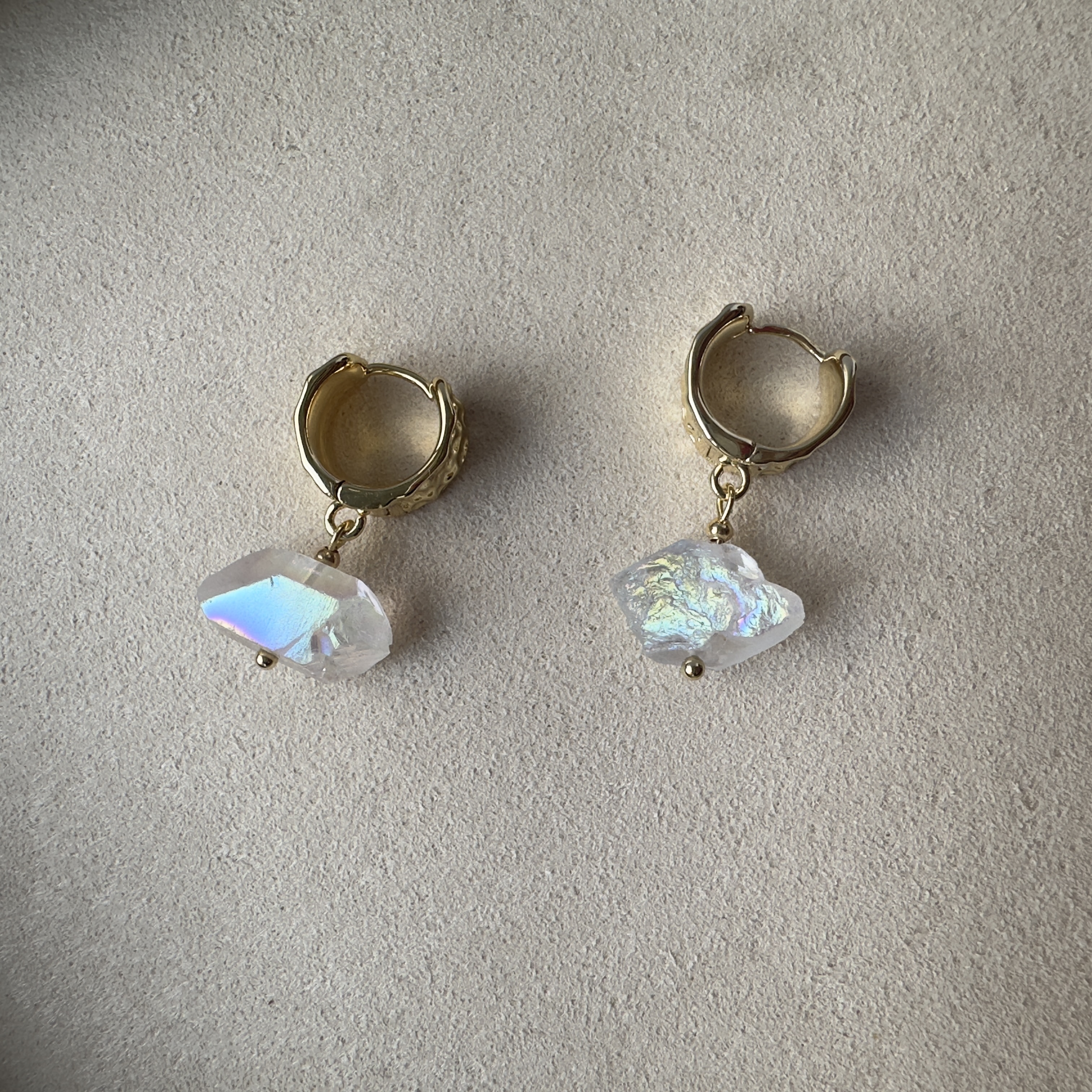 камень: натуральный кварц, тонированный (скол/галтовка) ≈ 15×8 мм, лёгкий радужный отлив;
