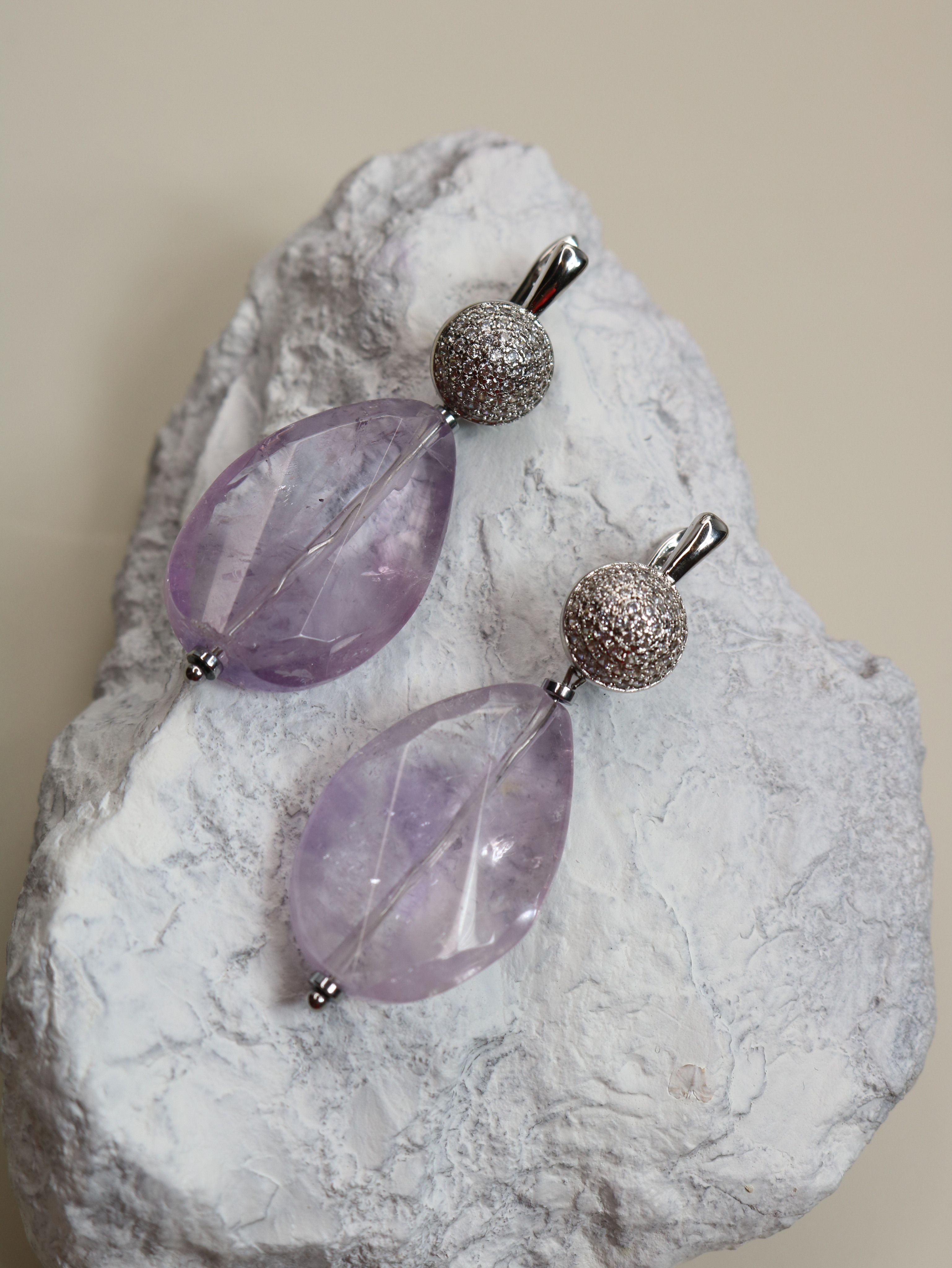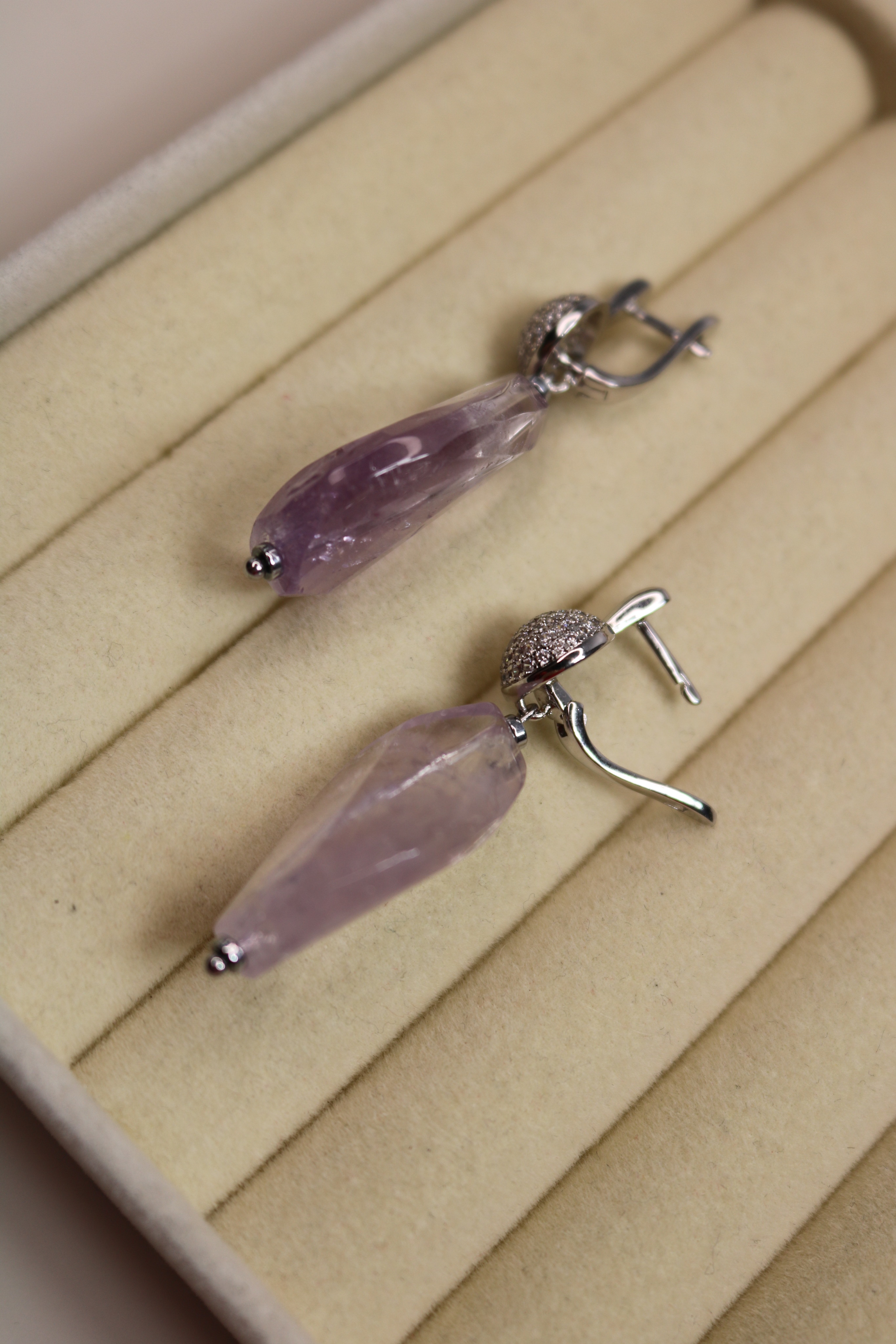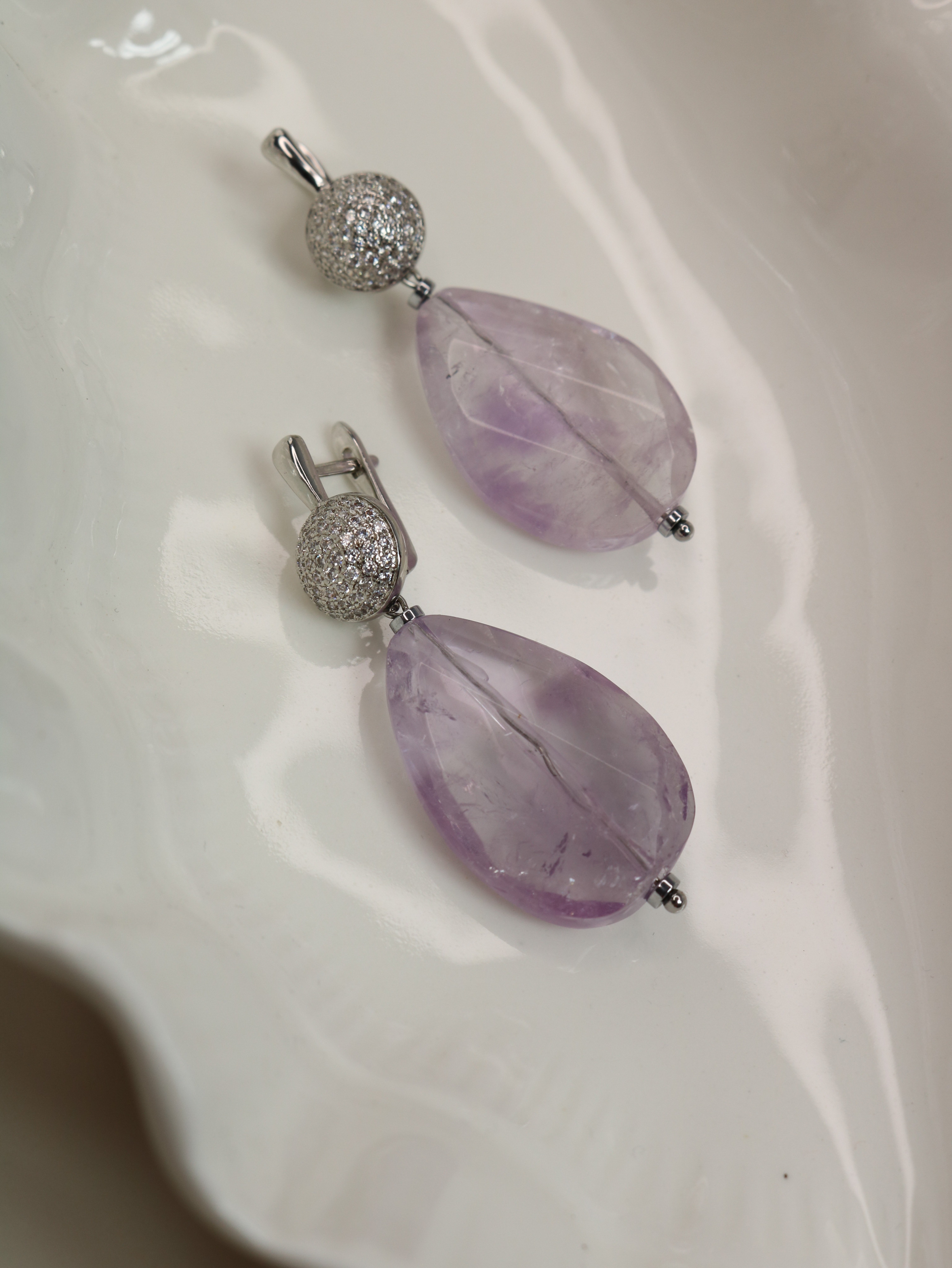 Материалы: натуральный аметист (огранка «лепесток» ≈ 30×20 мм), фианиты (инкрустация швензы), фурнитура под серебро (Южная Корея, гипоаллергенная).