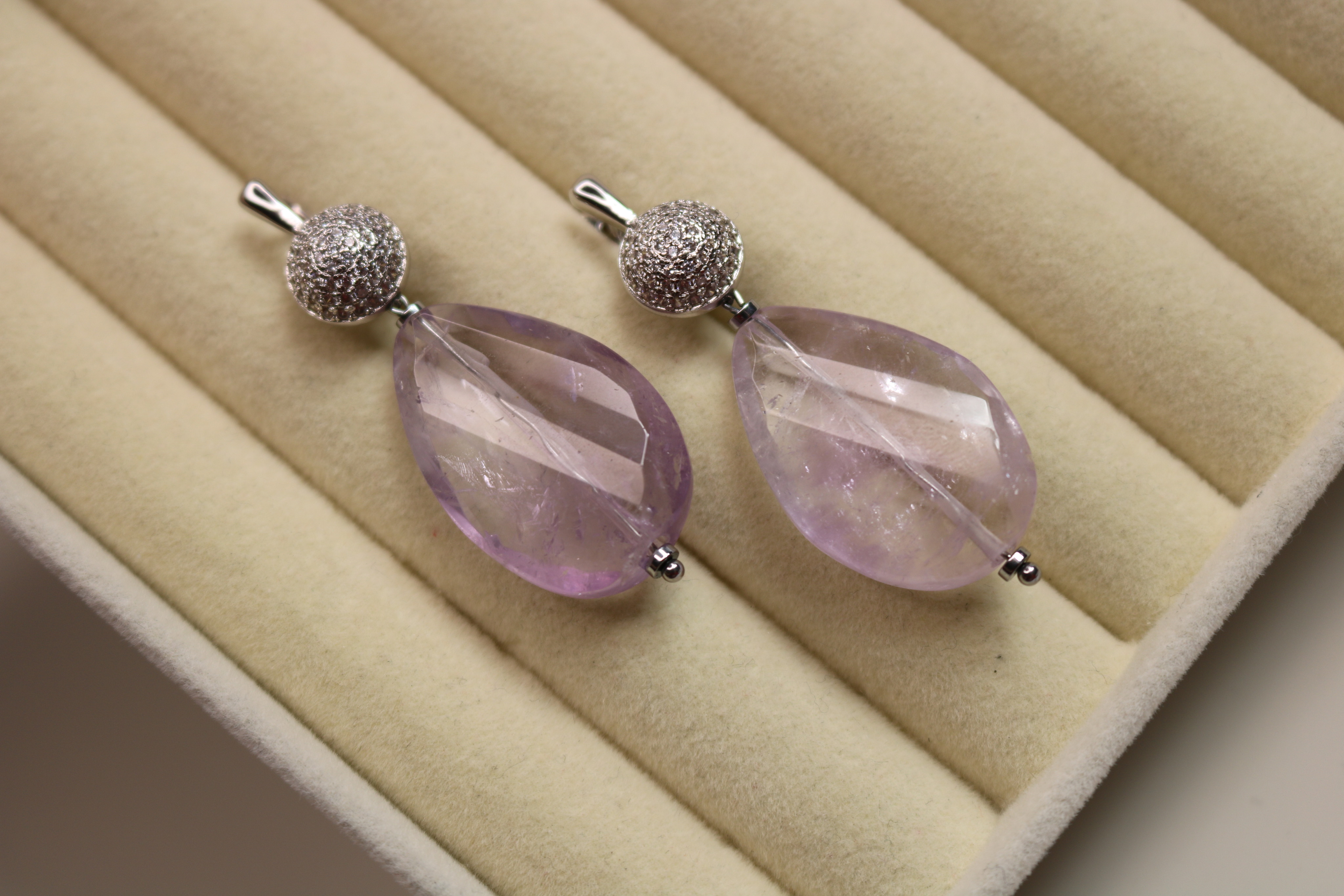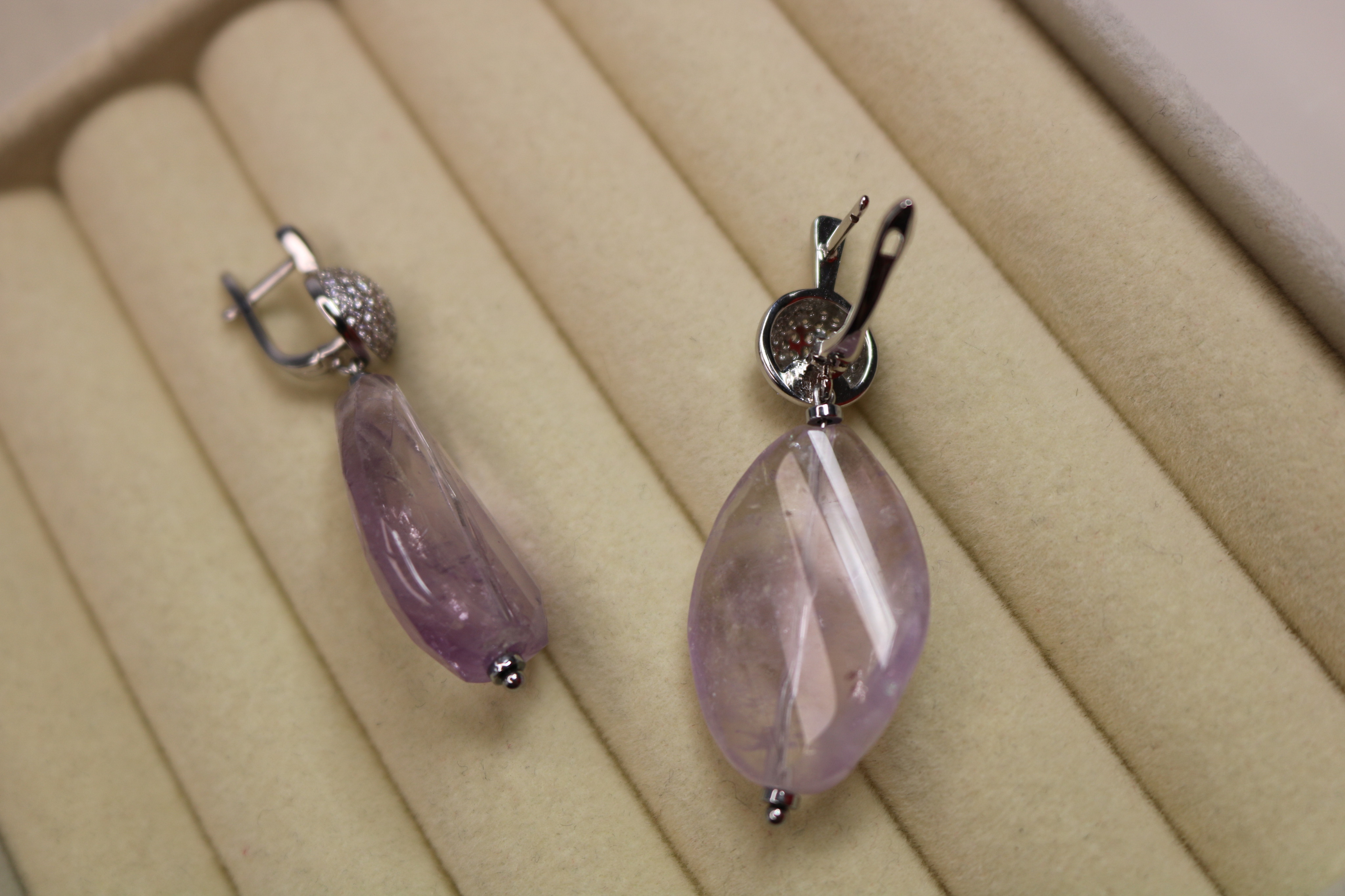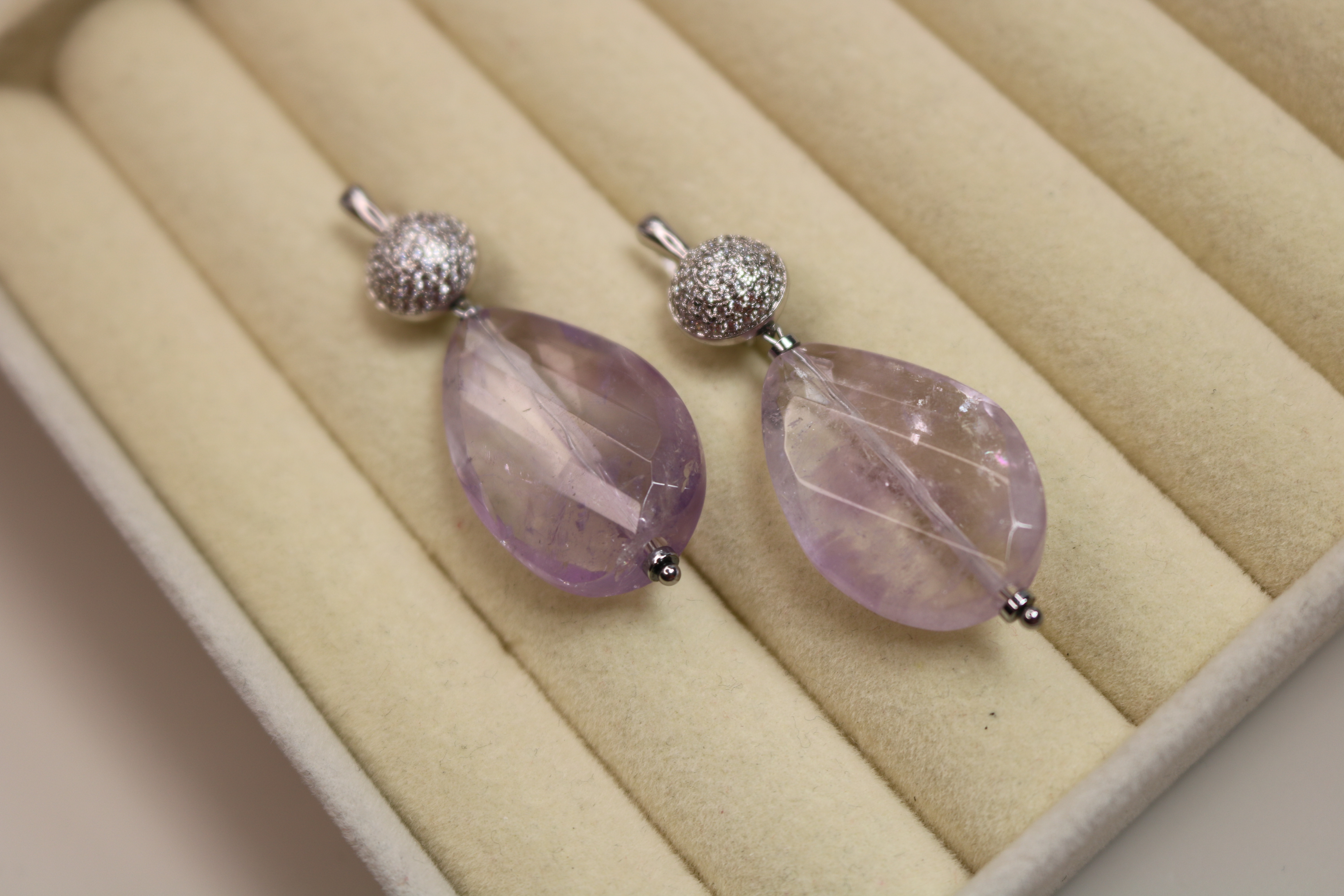 Материалы: натуральный аметист (огранка «лепесток» ≈ 30×20 мм), фианиты (инкрустация швензы), фурнитура под серебро (Южная Корея, гипоаллергенная).