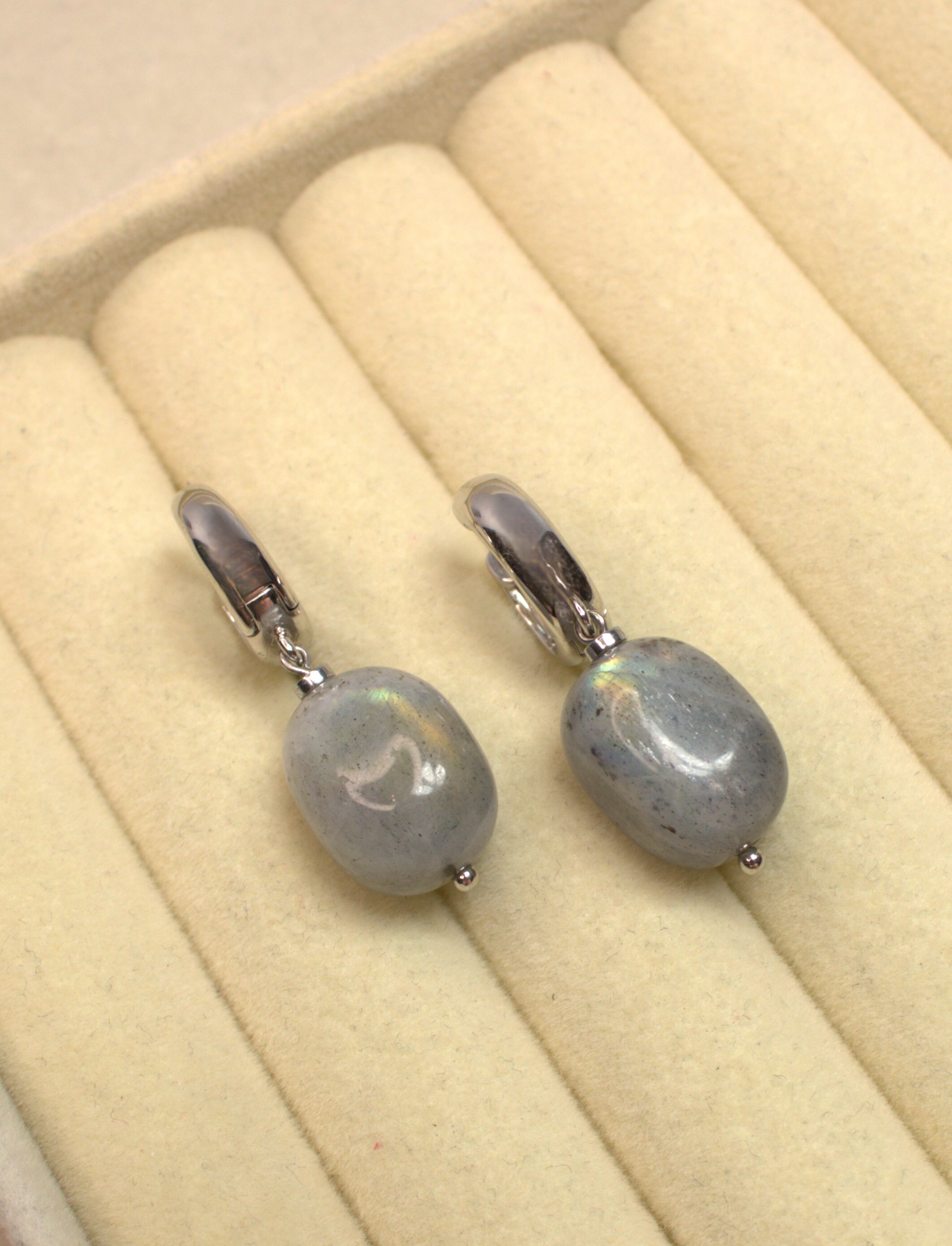 Основа — аккуратные серьги-конго диаметром 13 мм, к которым подвешены каплевидные вставки из лабрадора 16×12 мм.